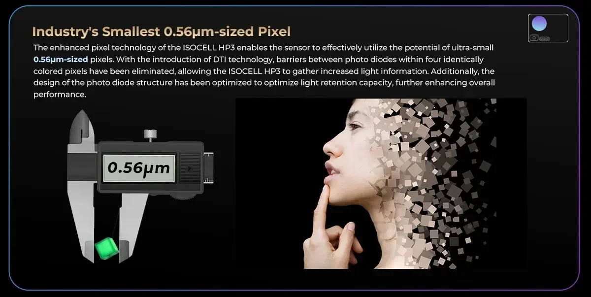 The enhanced pixel technology of the ISOCELL HP3 enables the sensor to effectively utilize the potential of ultra-small 0.56μm-sized pixels. With the introduction of DTI technology, barriers between photo diodes within four identically colored pixels have been eliminated, allowing the ISOCELL HP3 to gather increased light information. Additionally, the design of the photo diode structure has been optimized to optimize light retention capacity, further enhancing overall performance.
