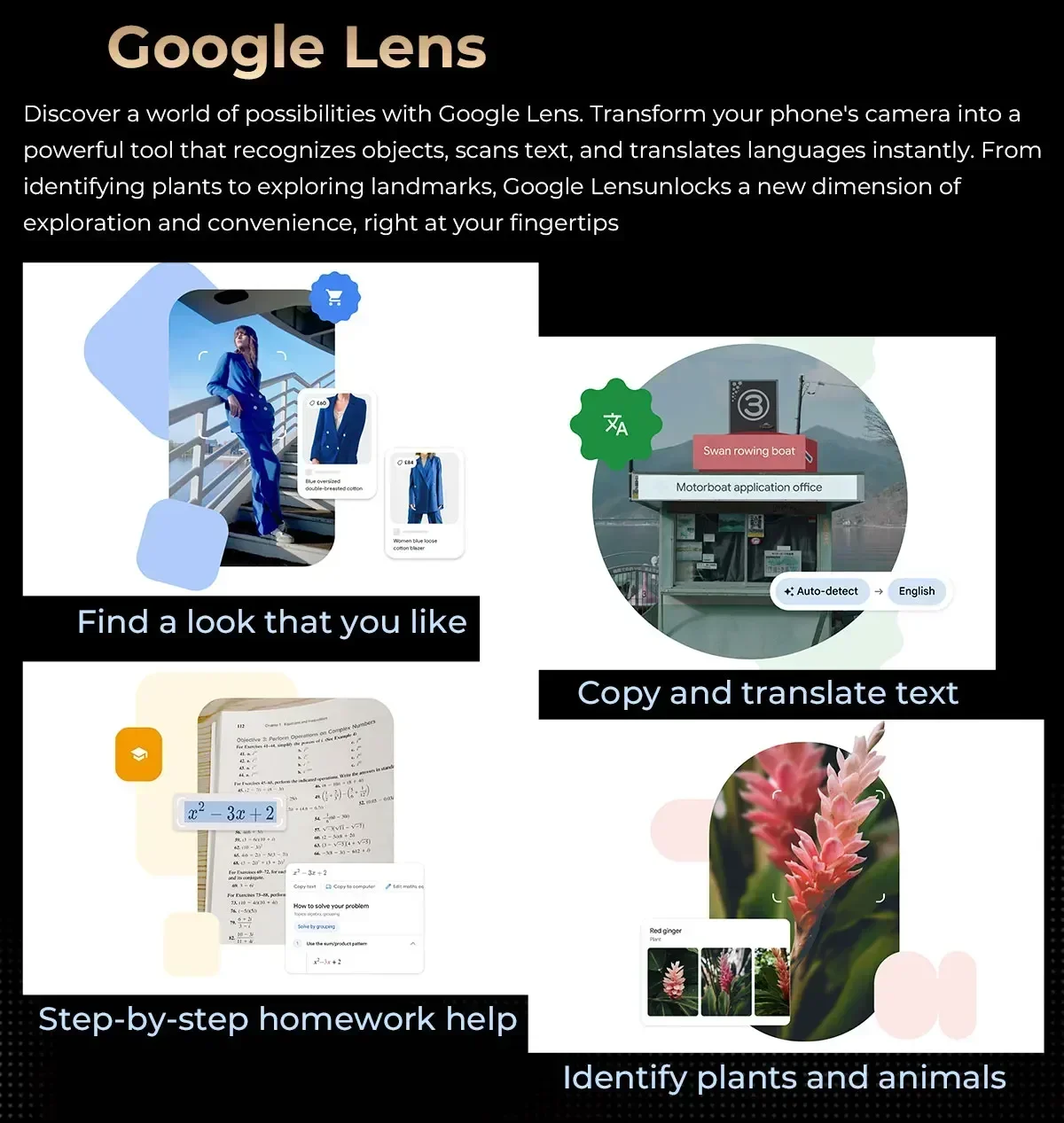 Discover a world of possibilities with Google Lens. Transform your phone's camera into a powerful tool that recognizes objects, scans text, and translates languages instantly. From identifying plants to exploring landmarks, Google Lens unlocks a new dimension of exploration and convenience, right at your fingertips.