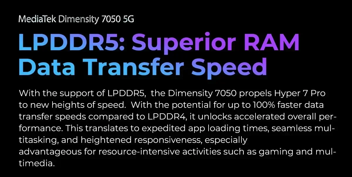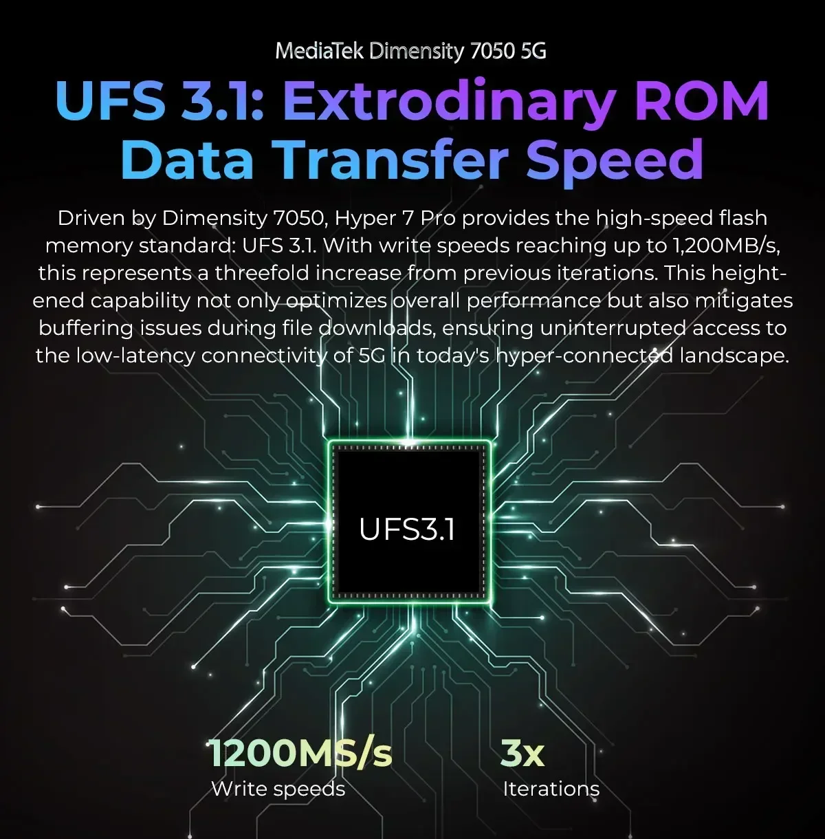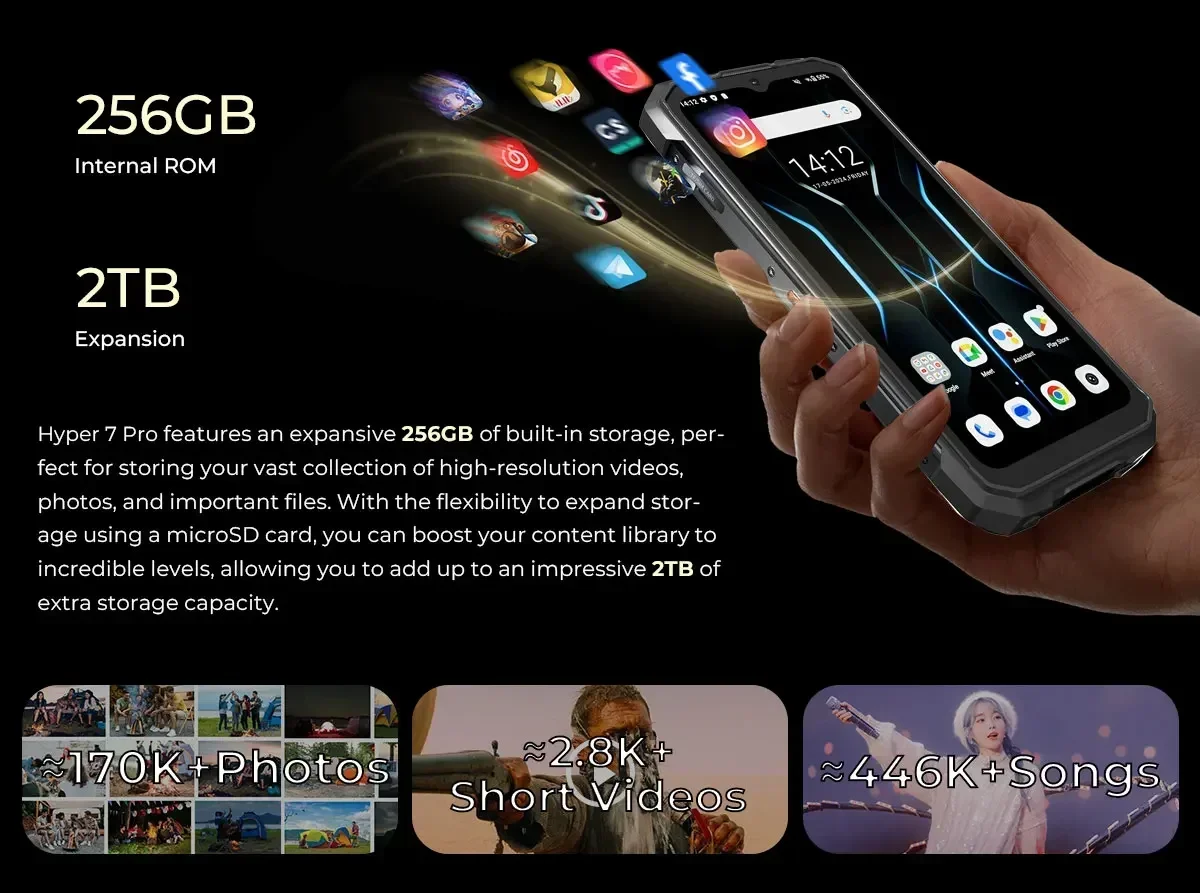 Hyper 7 Pro features an expansive 256GB of built-in storage, perfect for storing your vast collection of high-resolution videos, photos, and important files. With the flexibility to expand storage using a microSD card, you can boost your content library to incredible levels, allowing you to add up to an impressive 2TB of extra storage capacity.