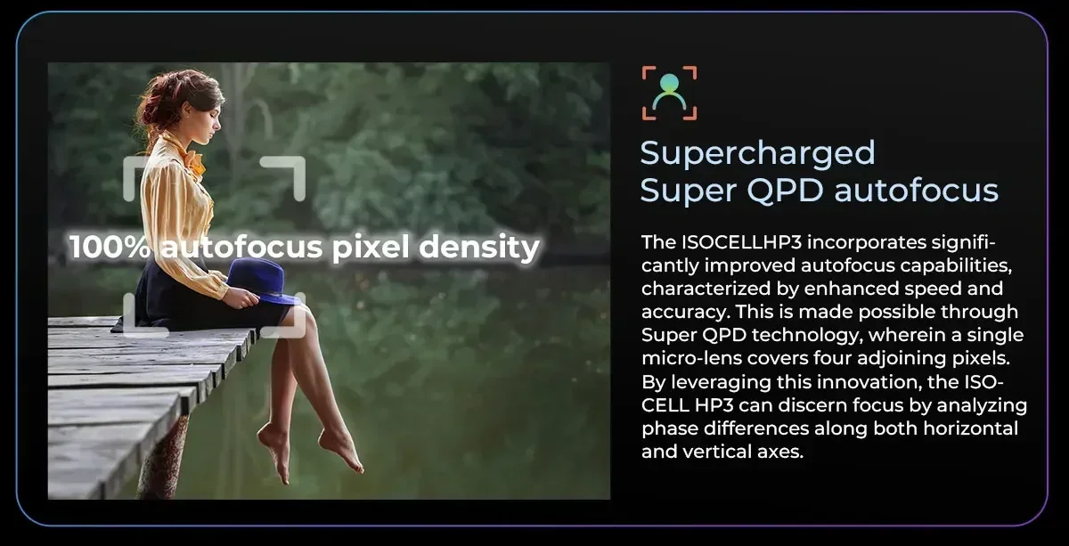 The ISOCELL HP3 incorporates significantly improved autofocus capabilities, characterized by enhanced speed and accuracy. This is made possible through Super QPD technology, where in a single micro-lens covers four adjoining pixels. By leveraging this innovation, the ISOCELL HP3 can discern focus by analyzing phase differences along both horizontal and vertical axes.