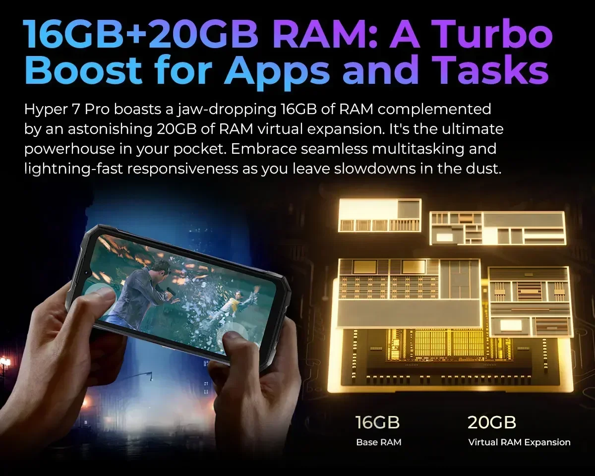 Hyper 7 Pro boasts a jaw-dropping 16GB of RAM complemented by an astonishing 20GB of RAM virtual expansion. It's the ultimate powerhouse in your pocket. Embrace seamless multitasking and lightning-fast responsiveness as you leave slowdowns in the dust. Elevate your mobile experience with the HOTWAV Hyper 7 Pro.