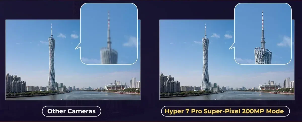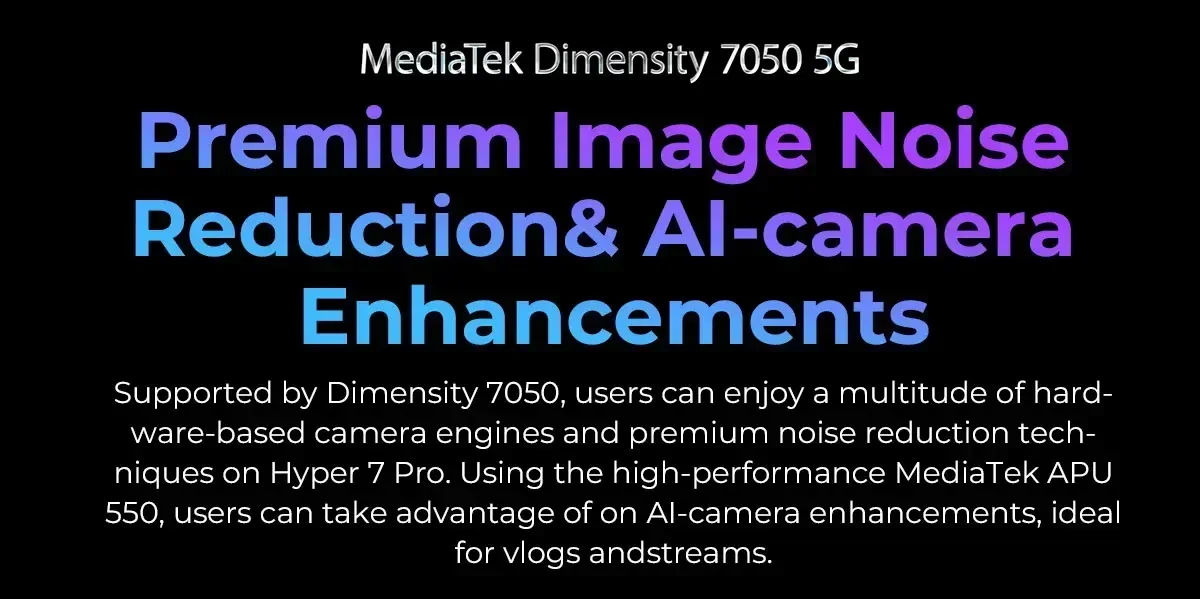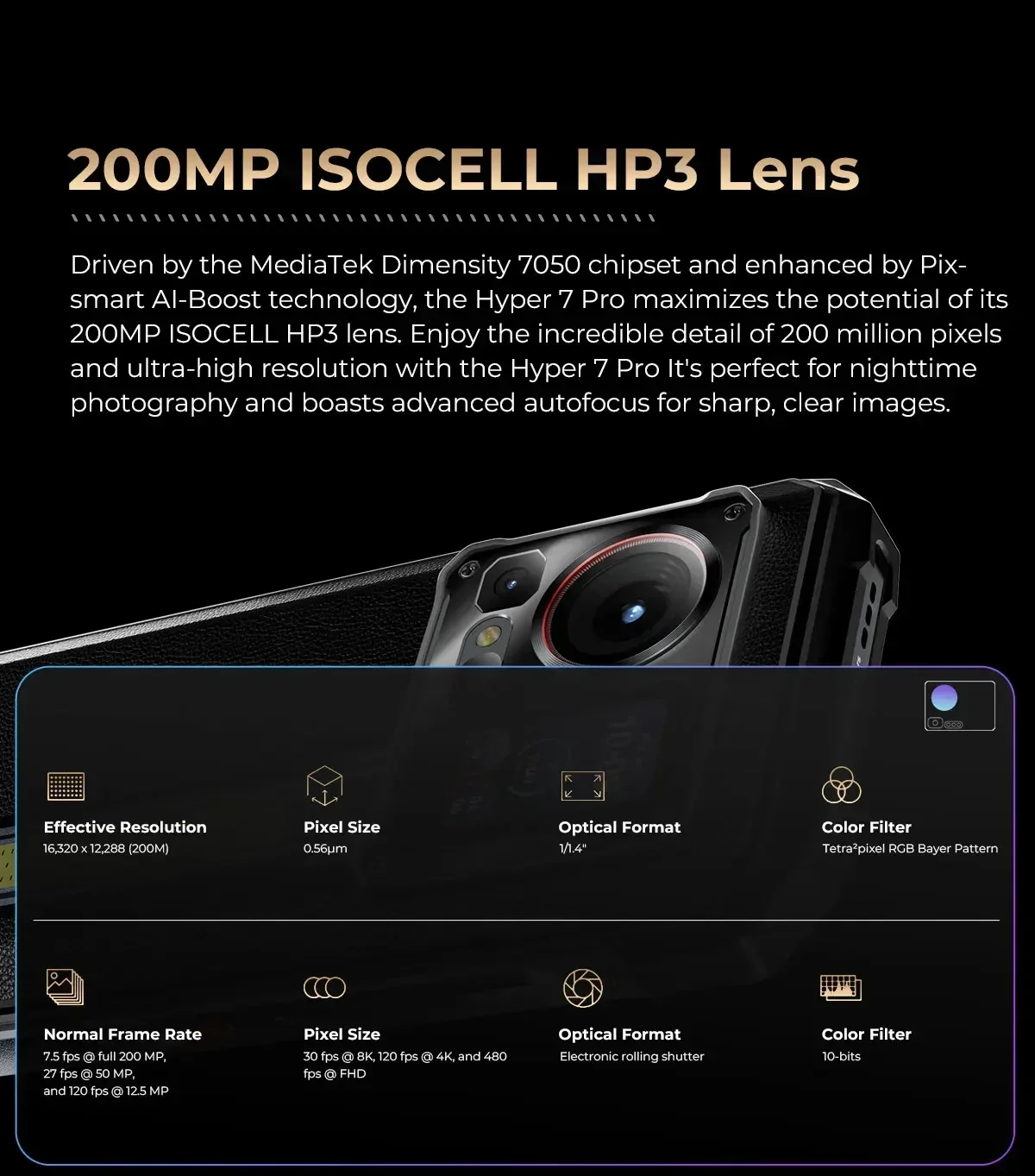 Driven by the MediaTek Dimensity 7050 chipset and enhanced by Pixsmart Al-Boost technology, the Hyper 7 Pro maximizes the potential of its 200MP ISOCELL HP3 lens. Enjoy the incredible detail of 200 million pixels and ultra-high resolution with the Hyper 7 Pro. It's perfect for nighttime photography and boasts advanced autofocus for sharp, clear images.