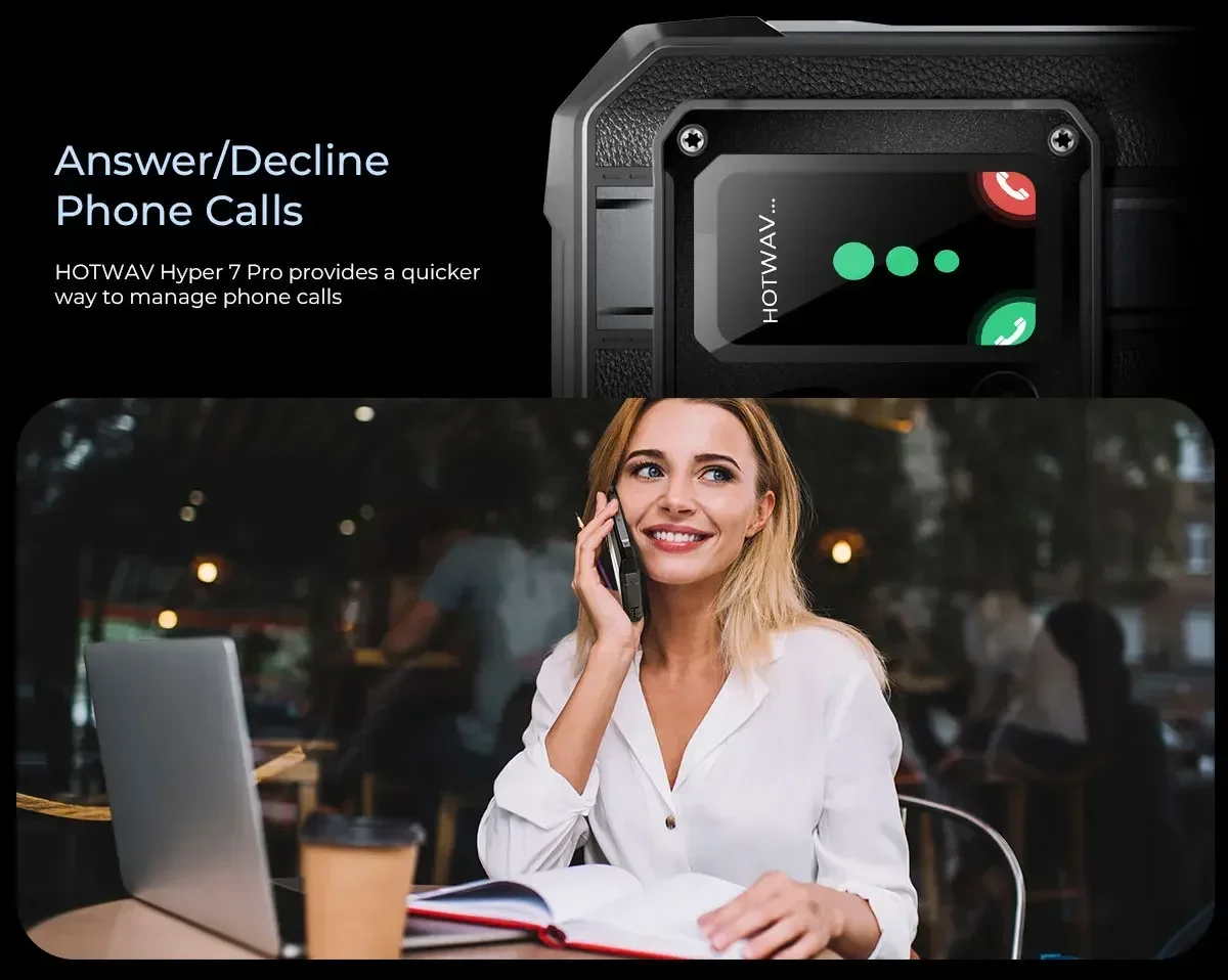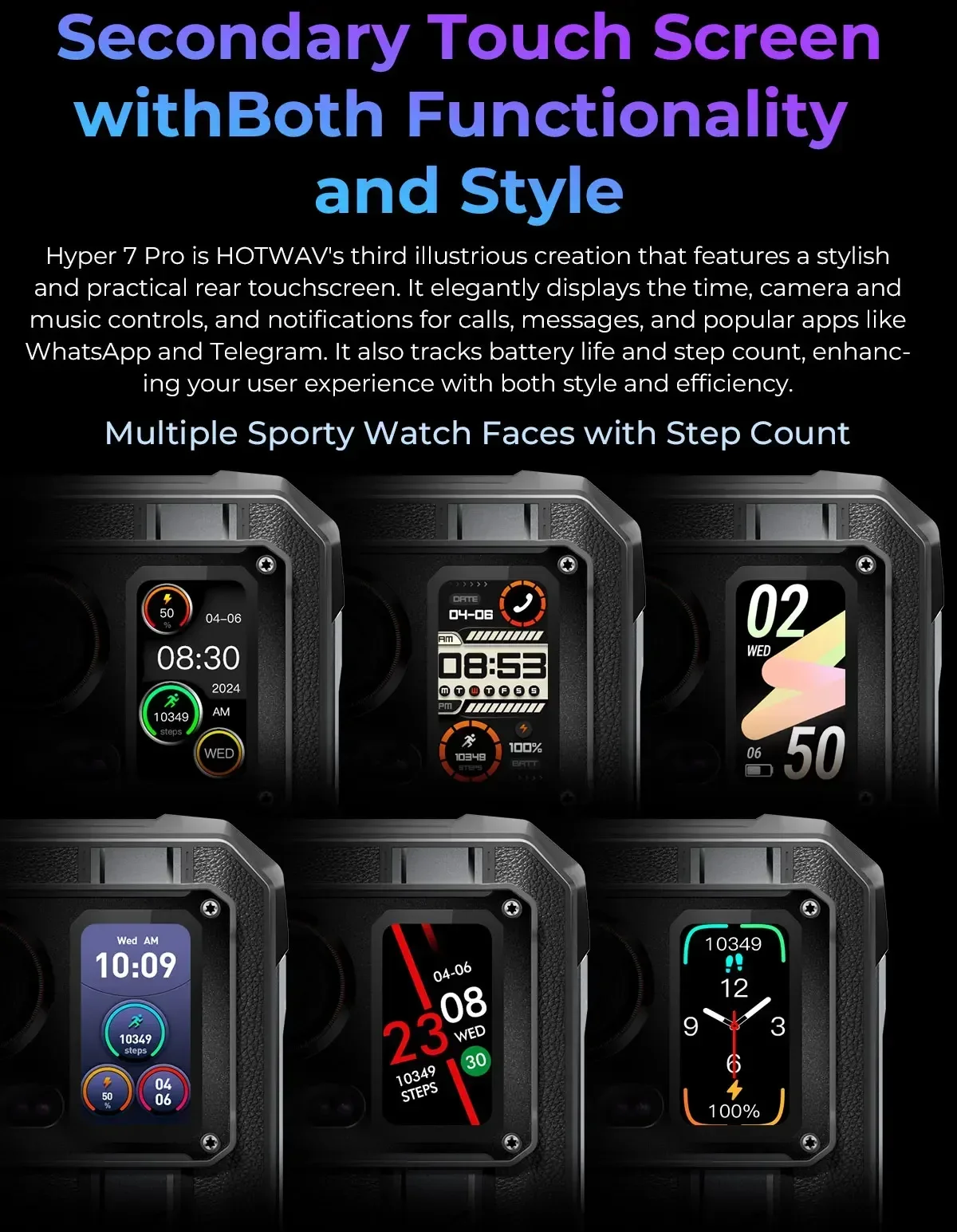 Hyper 7 Pro is HOTWAV's third illustrious creation that features a stylishand practical rear touchscreen. It elegantly displays the time, camera andmusic controls, and notifications for calls, messages, and popular apps like WhatsApp and Telegram. It also tracks battery life and step count, enhancing your user experience with both style and efficiency.