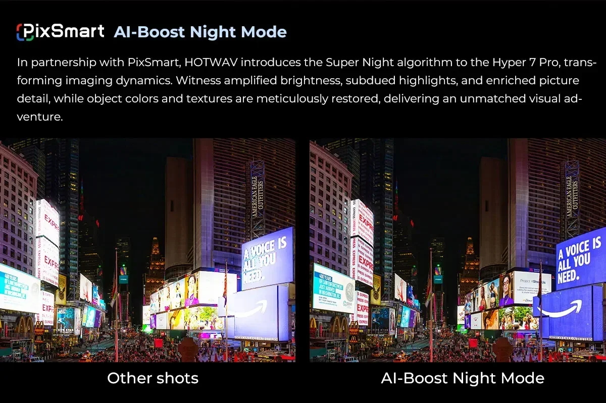 In partnership with PixSmart, HOTWAV introduces the Super Night algorithm to the Hyper 7 Pro, transforming imaging dynamics. Witness amplified brightness, subdued highlights, and enriched picture detail, while object colors and textures are meticulously restored, delivering an unmatched visual adventure.