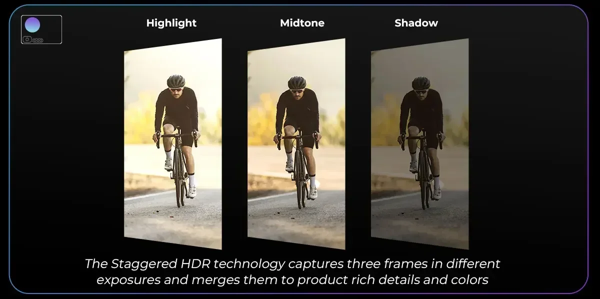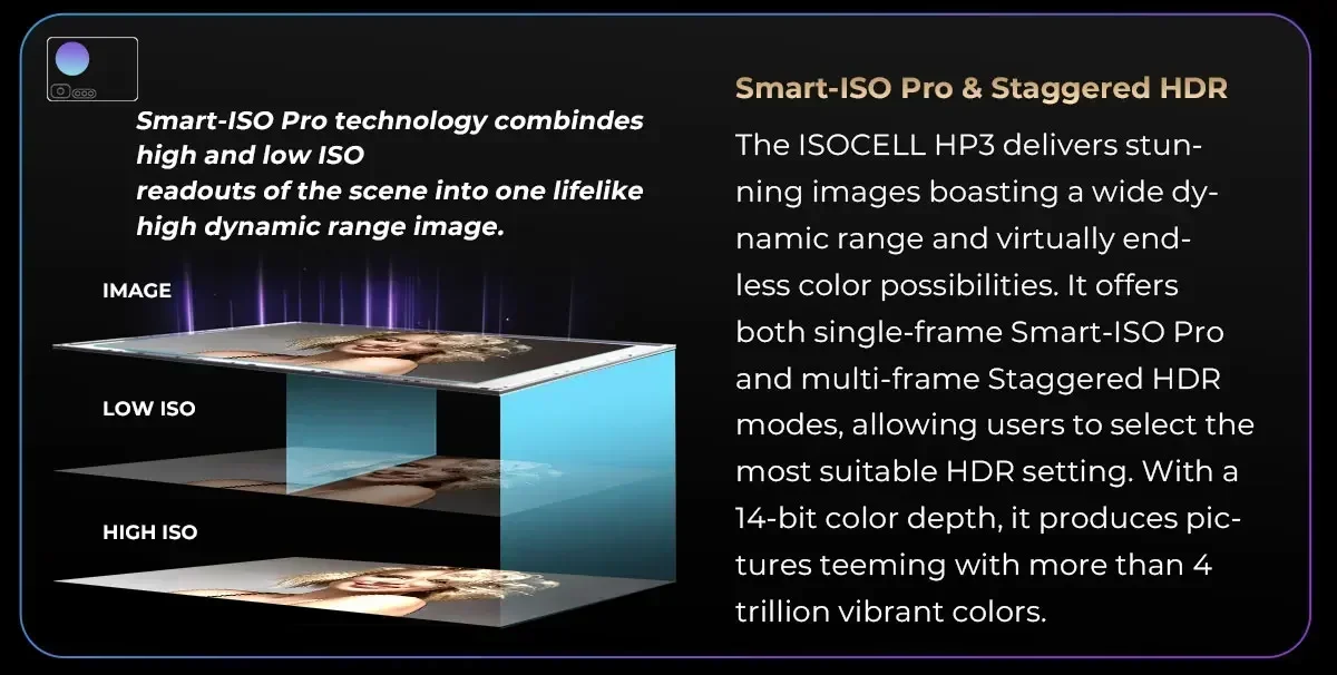 The ISOCELL HP3 delivers stunning images boasting a wide dynamic range and virtually endless color possibilities, It offers both single-frame Smart-ISO Pro and multi-frame Staggered HDR modes, allowing users to select themost suitable HDR setting. With a 14-bit color depth, it produces pictures teeming with more than 4 trillion vibrant colors.