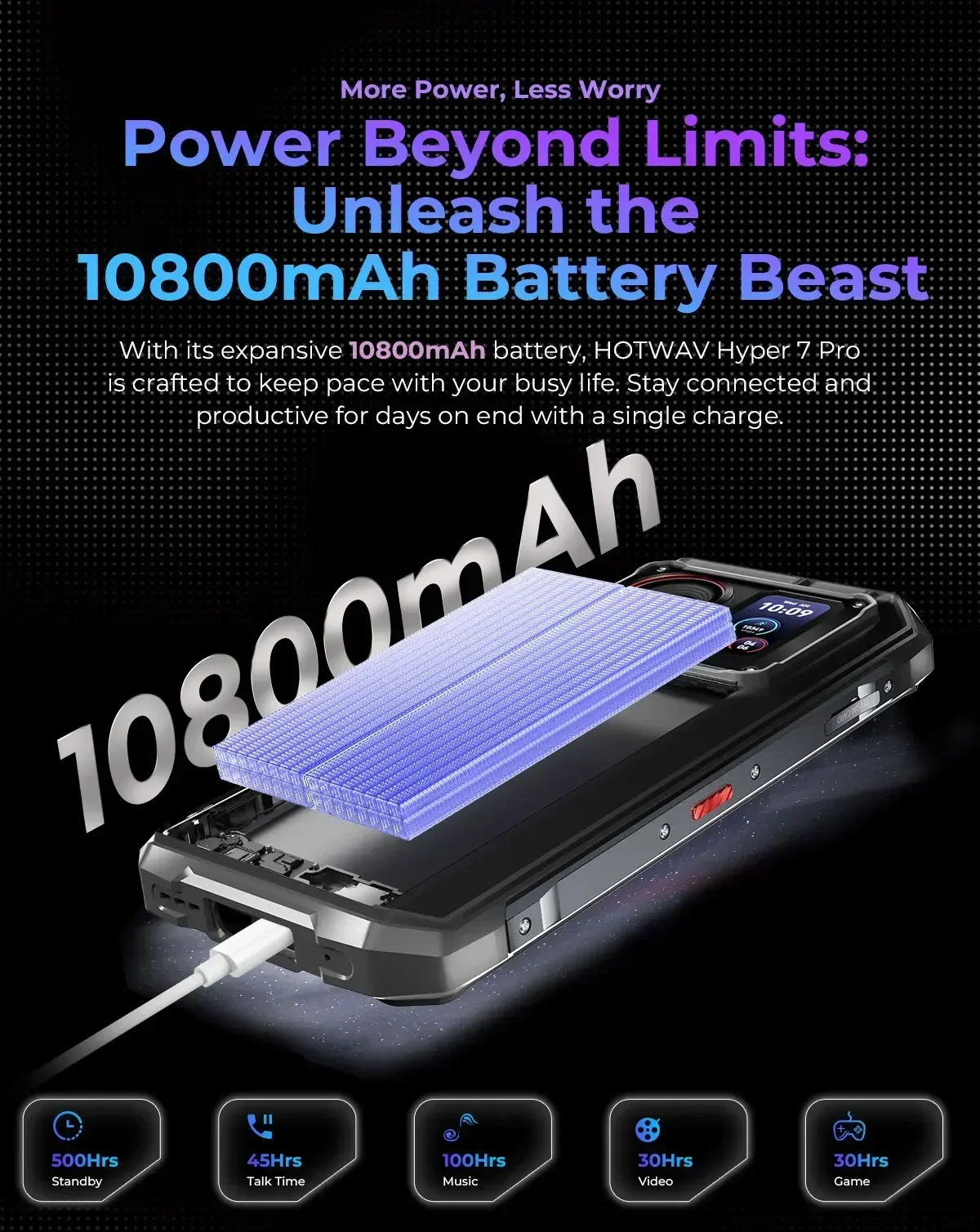 With its expansive 10800mAh battery, HOTWAV Hyper 7 Pro is crafted to keep pace with your busy life. Stay connected and productive for days on end with a single charge.