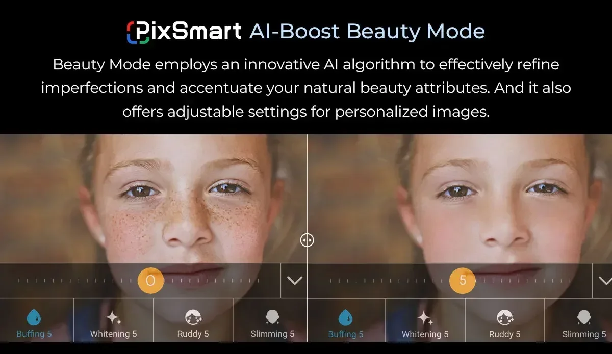 Beauty Mode employs an innovative AI algorithm to effectively refine imperfections and accentuate your natural beauty attributes. And it also offers adjustable settings for personalized images.