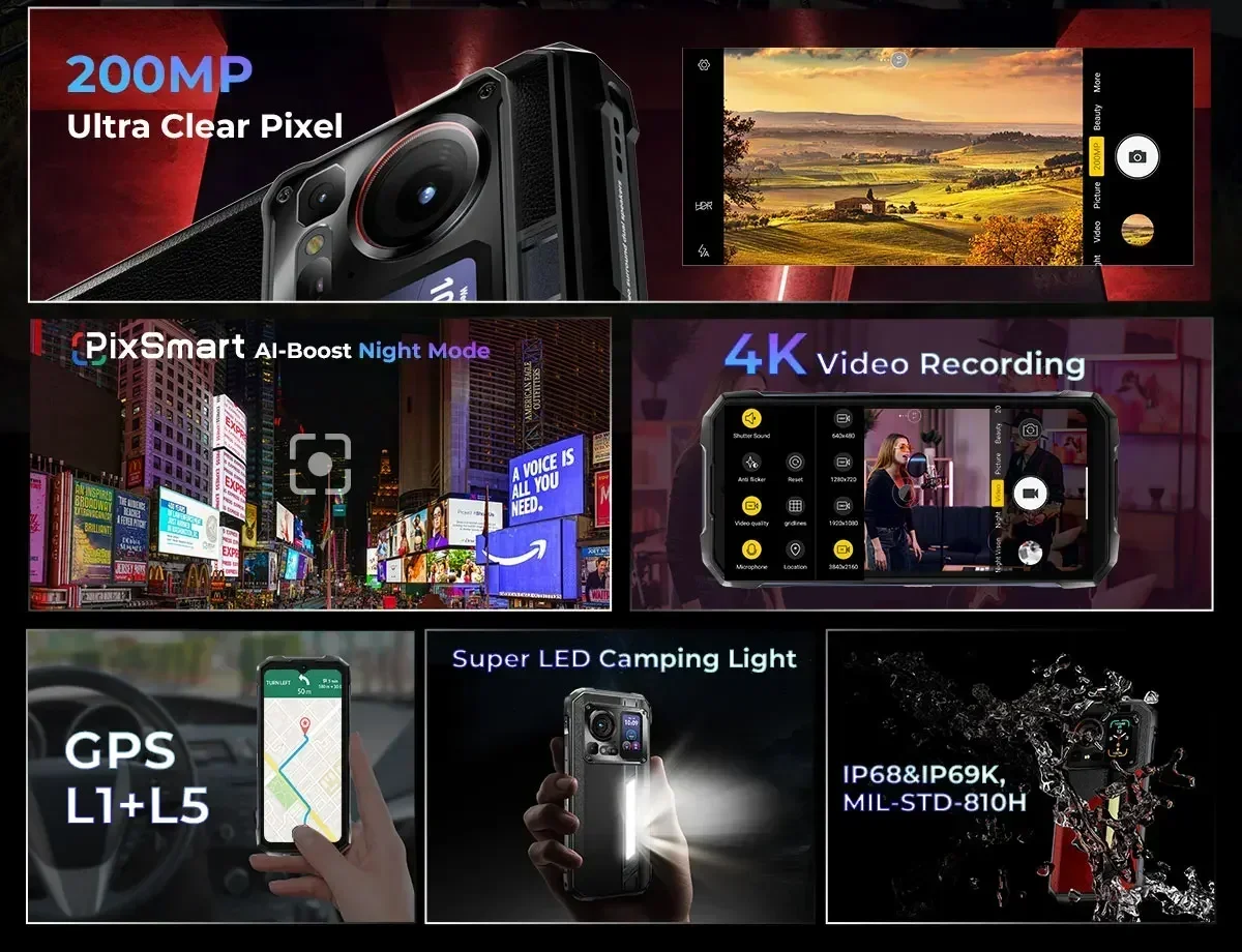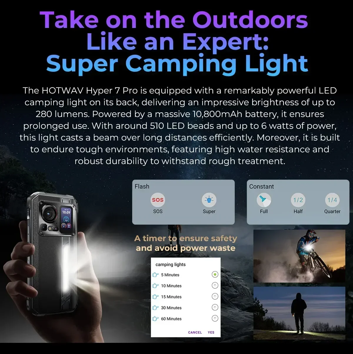 The HOTWAV Hyper 7 Pro is equipped with a remarkably powerful LED camping light on its back, delivering an impressive brightness of up to 280 lumen. Powered by a massive 10800mAh battery, it ensures prolonged use. With around 510 LED beads and up to 6 watts of power, this light casts a beam over long distances efficiently. Moreover, it is built to endure tough environments, featuring high water resistance and robust durability to withstand rough treatment.
