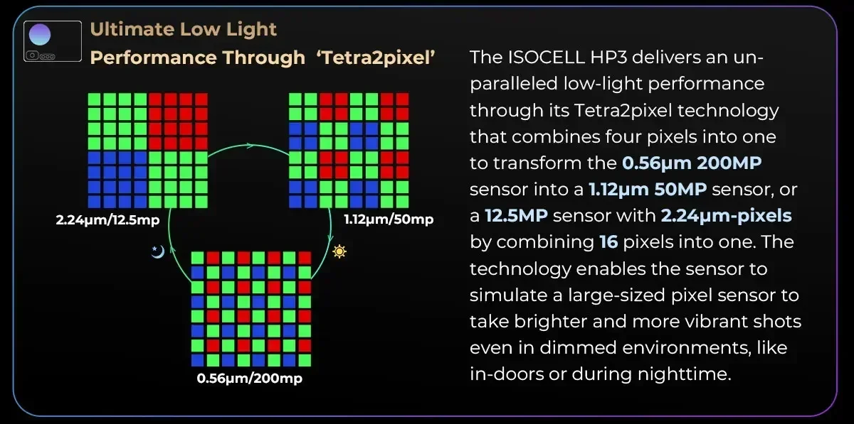 The ISOCELL HP3 delivers an unparalleled low-light performance through its Tetra2pixel technology that combines four pixels into one to transform the 0.56μm 200MP sensor into a 1.12μm 50MP sensor, or a 12.5MP sensor with 2.24μm-pixels by combining 16 pixels into one. The technology enables the sensor to simulate a large-sized pixel sensor to take brighter and more vibrant shots even in dimmed environments, like in-doors or during nighttime.