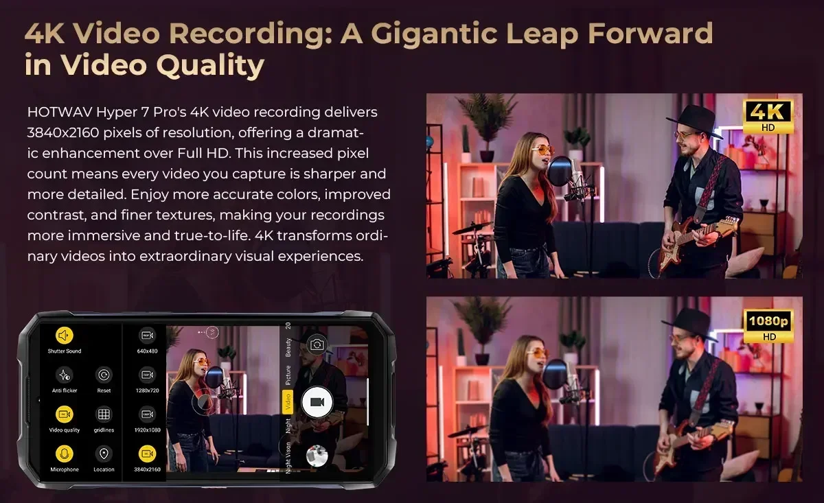 HOTWAV Hyper 7 Pro's 4K video recording delivers 3840×2160 pixels of resolution, offering a dramatic enhancement over Full HD. This increased pixel count means every video you capture is sharper and more detailed. Enjoy more accurate colors, improved contrast, and finer textures, making your recording smore immersive and true-to-life. 4K transforms ordinary videos into extraordinary visual experiences.