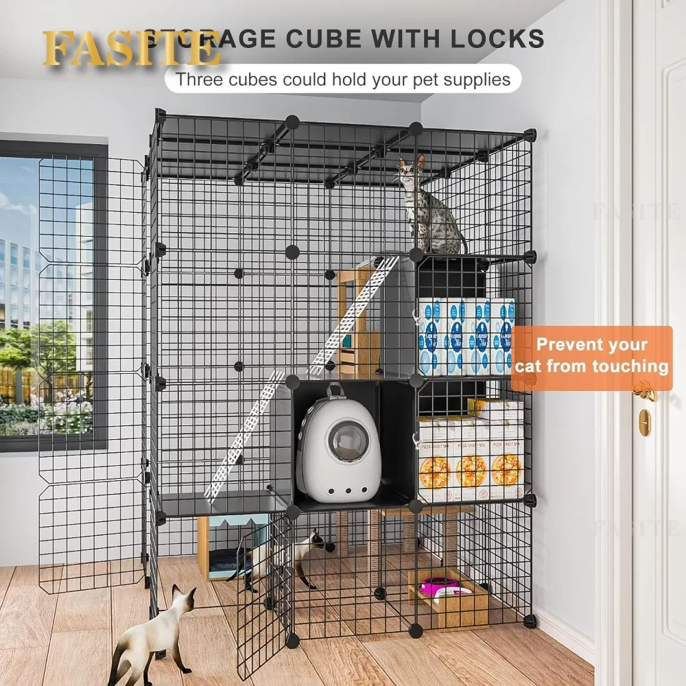• 【Storage Cubes with door】The indoor cat cage enclosure includes 3 storage cabinets that you could easily storage pet suppliers. We specially design doors with lock to prevent your cat from touching. Each storage cube is 14″x14″x14″,bearing more than 30 lbs.The storage cube of the kitten cage is large enough to store all of suppliers.You need not spent extra money purchasing storage cabinet.