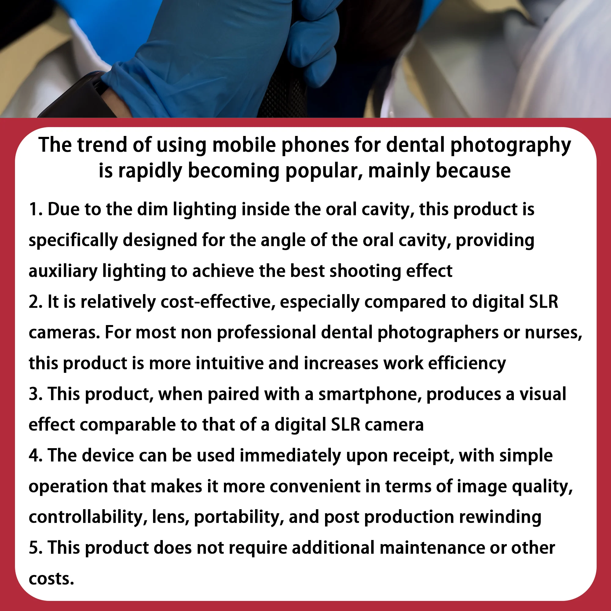This product is the best equipment for oral photography, providing exceptional results in education, promotions, advertisements, and showcasing dental treatments to clients. You can use the photos for dental reports, social media posts, and more.