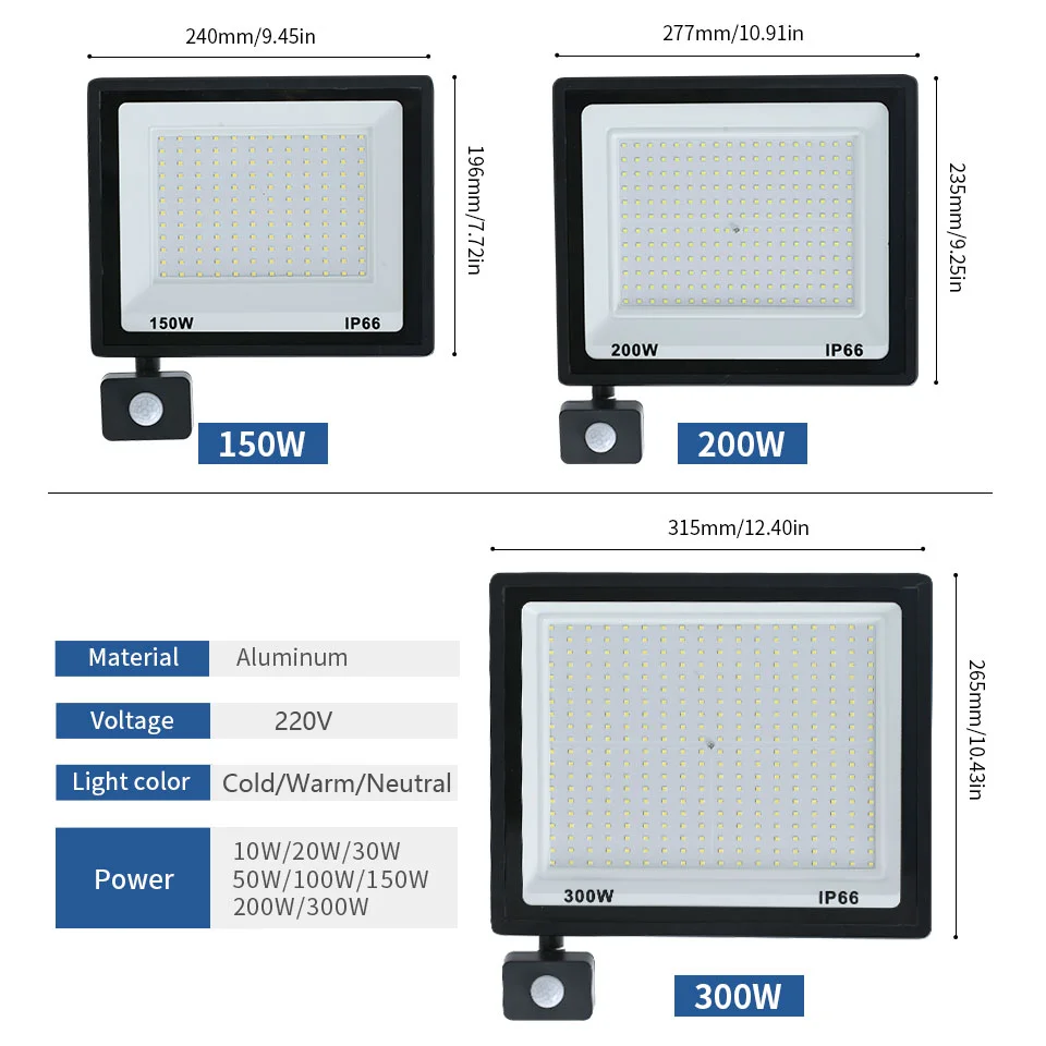 LED Flood Light PIR Motion Sensor 10W 20W 30W 50W 100W 150W 200W 300W AC220V IP66 Waterproof Spotlight Street Floodlight Outdoor
