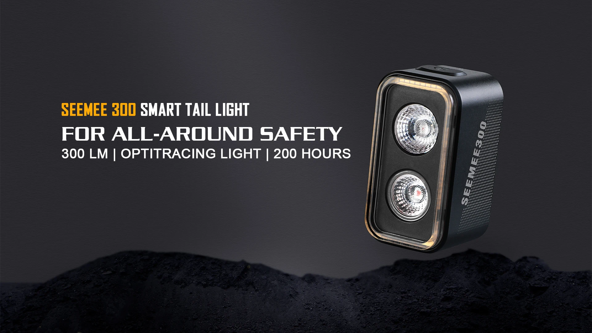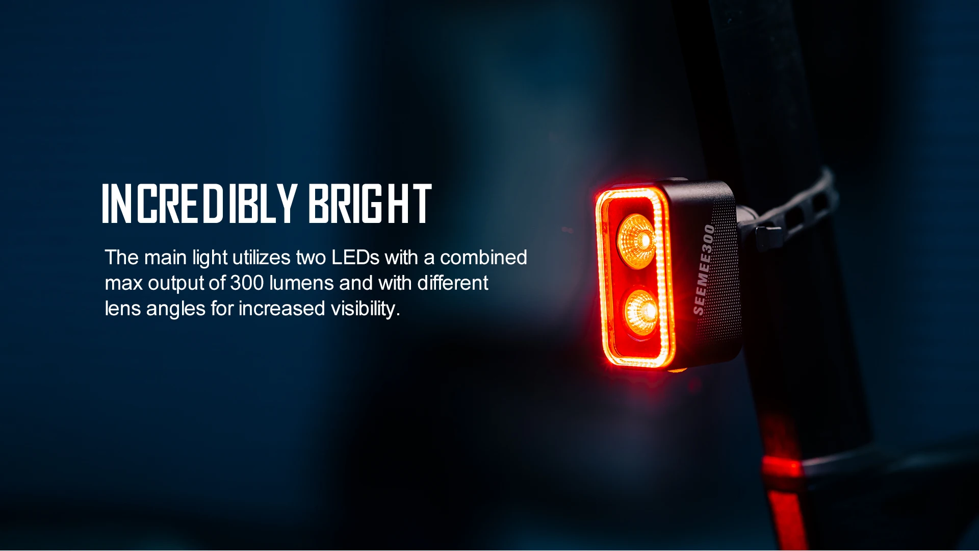The main light utilizes two LEDs with a combined max output of 300 lumens and with differenet lens angles for increased visibility.(Max Visibility Distance 3000 Meters)