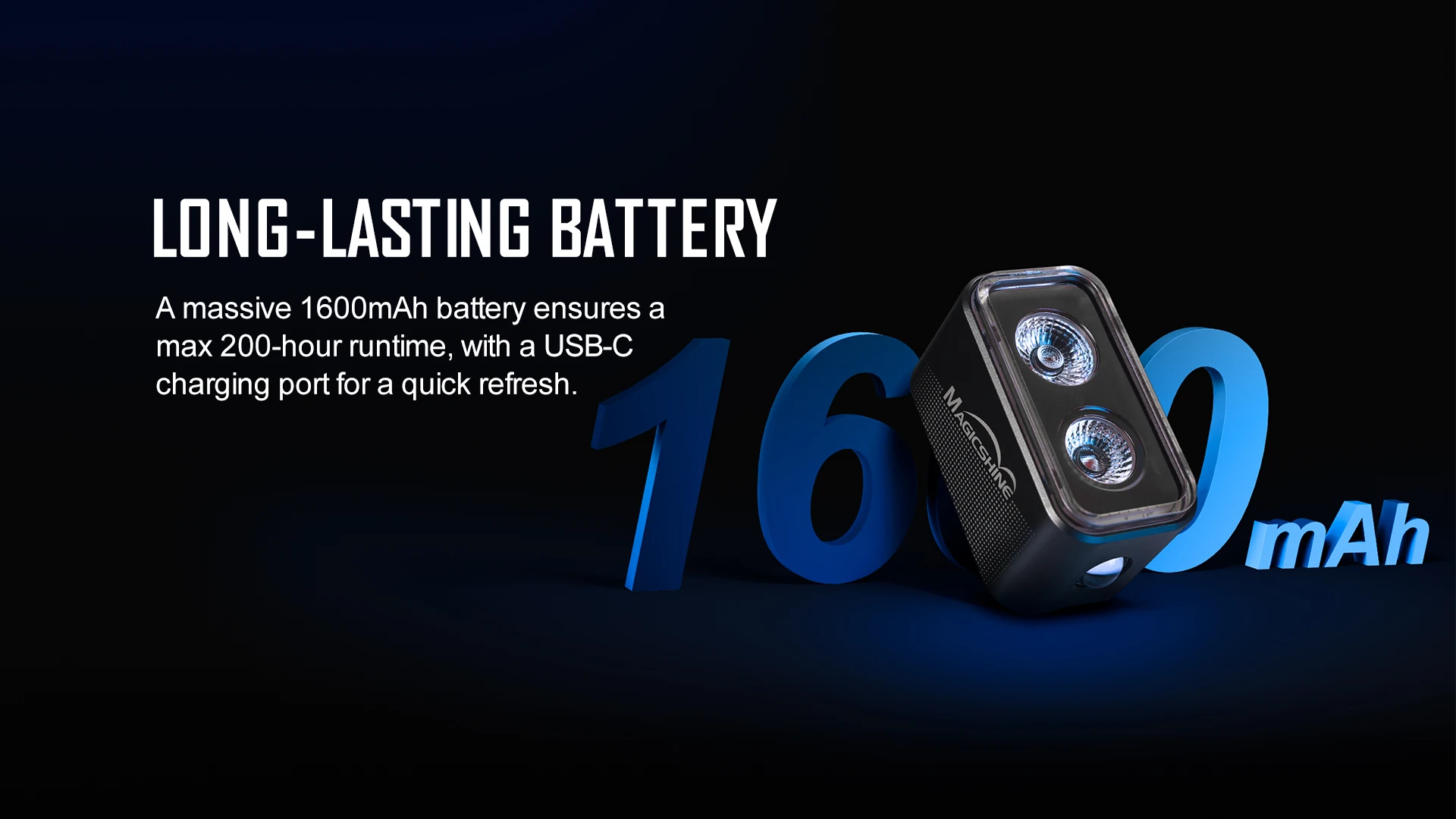 Equipped with a USB-C Port for charging,2 hours get a full charge, 1600 mAh battery allows you to use ECO mode up to 200 hours of runtime.
