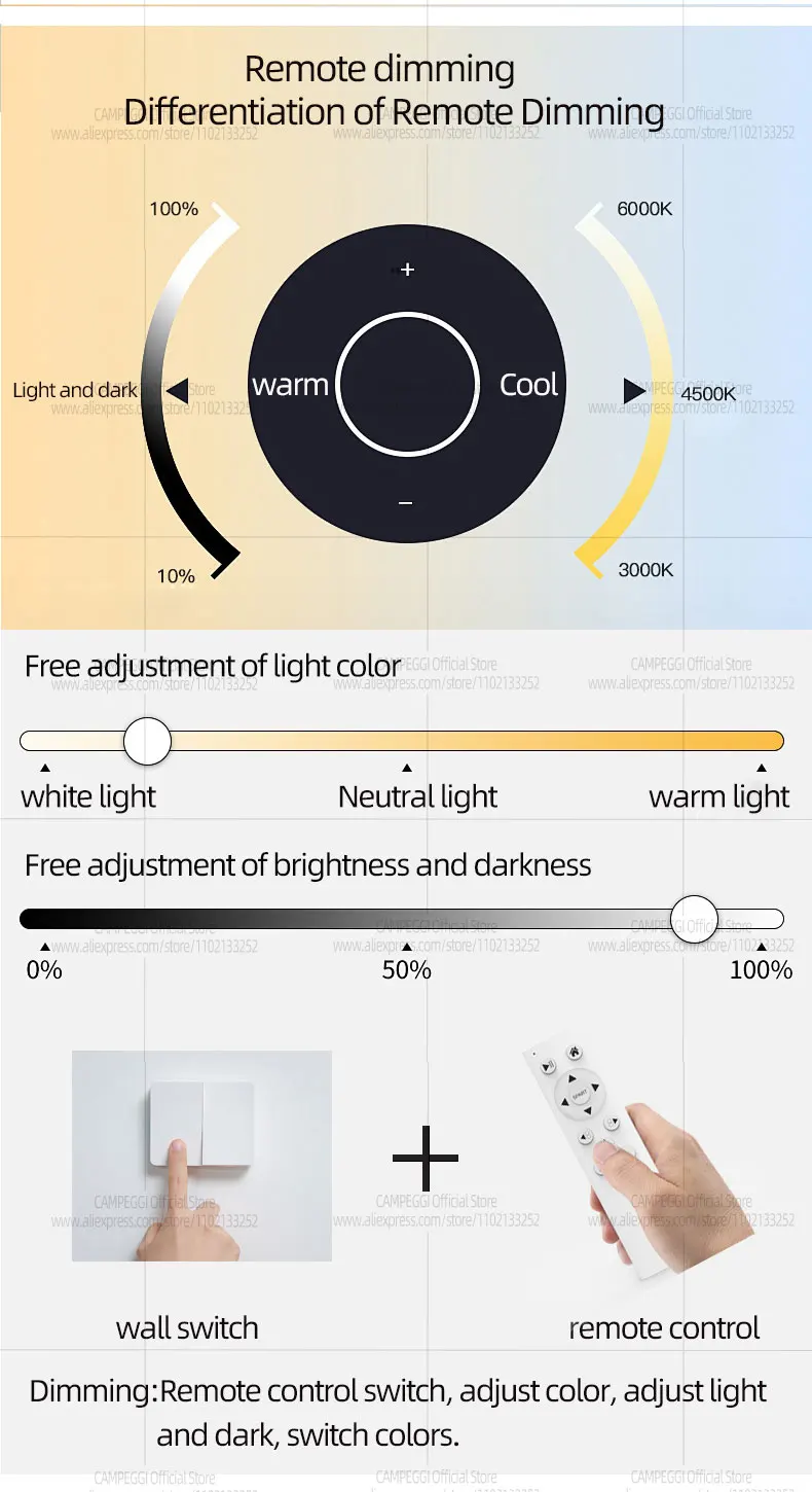 Single color, (no remote control, no dimming),Remote dimming: includes: (warm light, neutral light, white light, adjustable dark and bright)