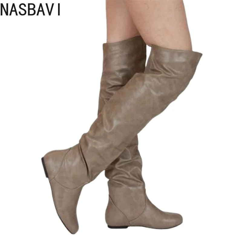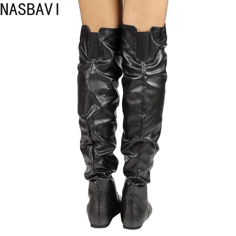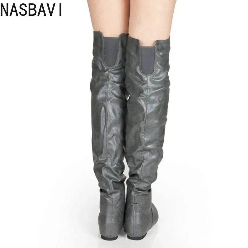 NASBAVI Over The Knee Boots Women Pu Elastic Boots Female Round Toe Shoes Concise Flat Shoes Autumn Winter 2025 Plus Size 34-48