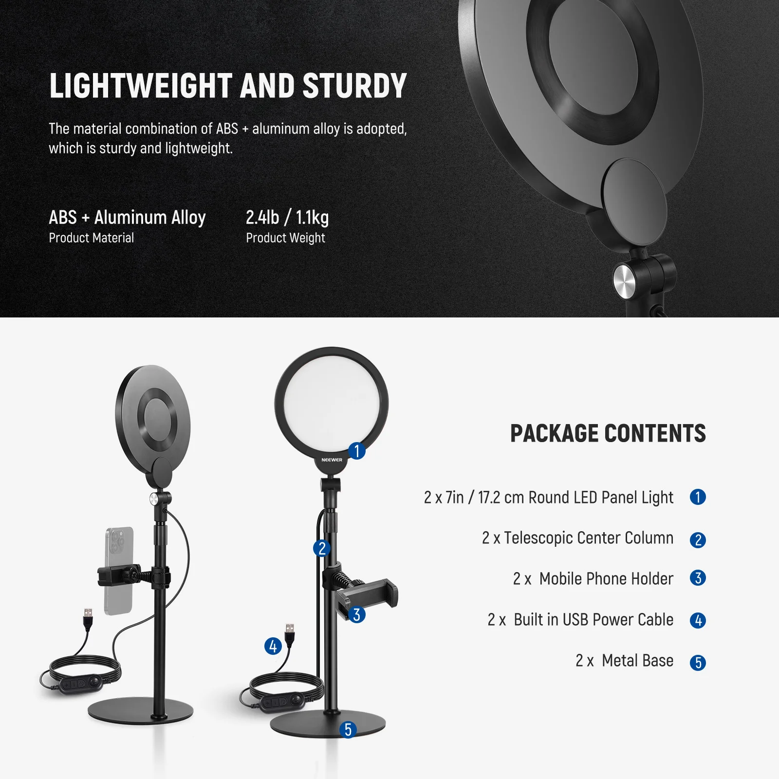 【7" LED Panel Video Light】 With 84 LEDs, NEEWER R06 small desk ring light offers up to 680lux illumination at 0.5m, 3000K-6500K color temperature, and CRI>95. The weighed metal base and the telescopic center column ensure height adjustment, and the phone holder compatible with iPhone is included for added versatility, ideal for makeup lighting, selfies, Tiktok/Youtube video recording, podcast, Facetime, Zoom calls, video conferences, live streaming, vlogging, filming, etc.