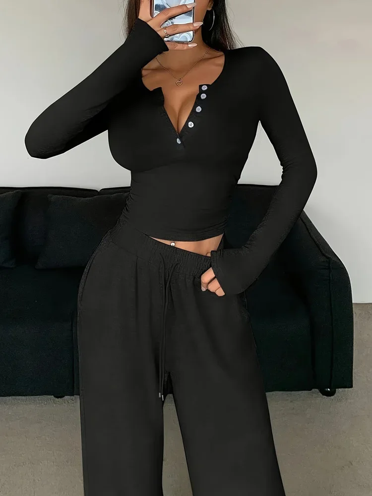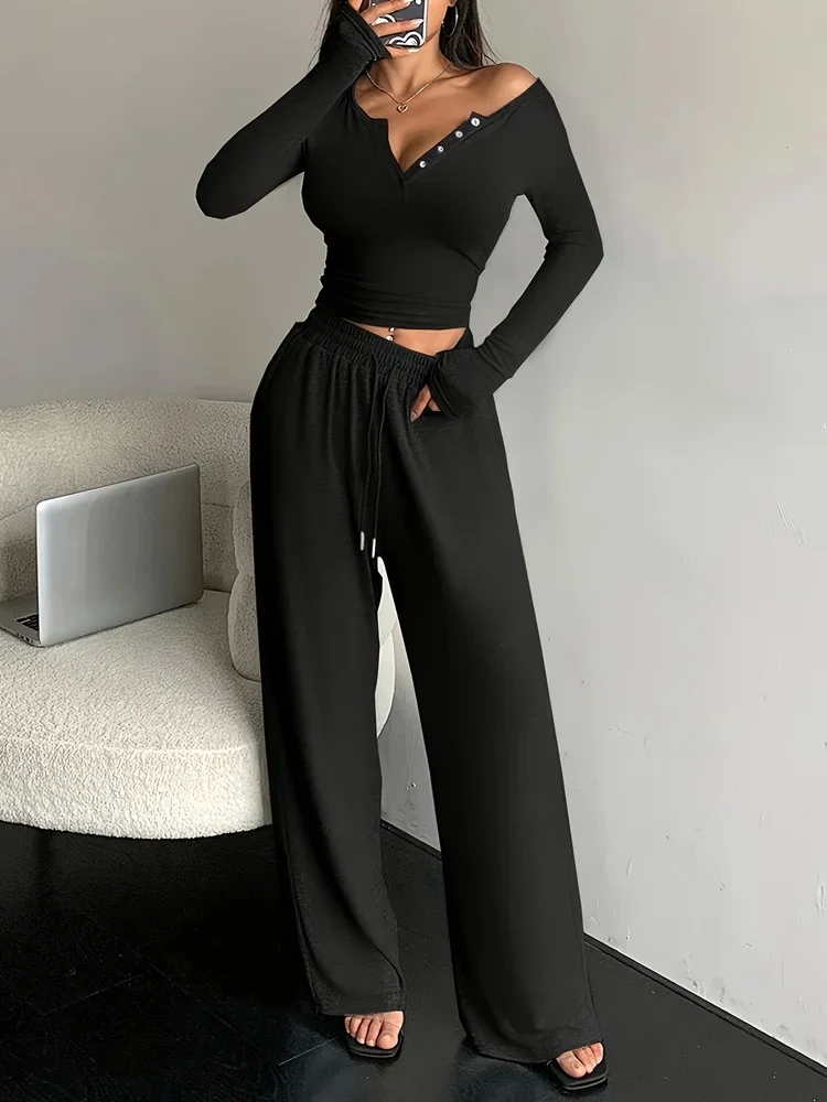 New 2025 Women’s Winter and Spring Solid Color Sports Set Long Sleeve T-shirt Bottom Shirt Wide Leg Pants Long Pants Two Piece