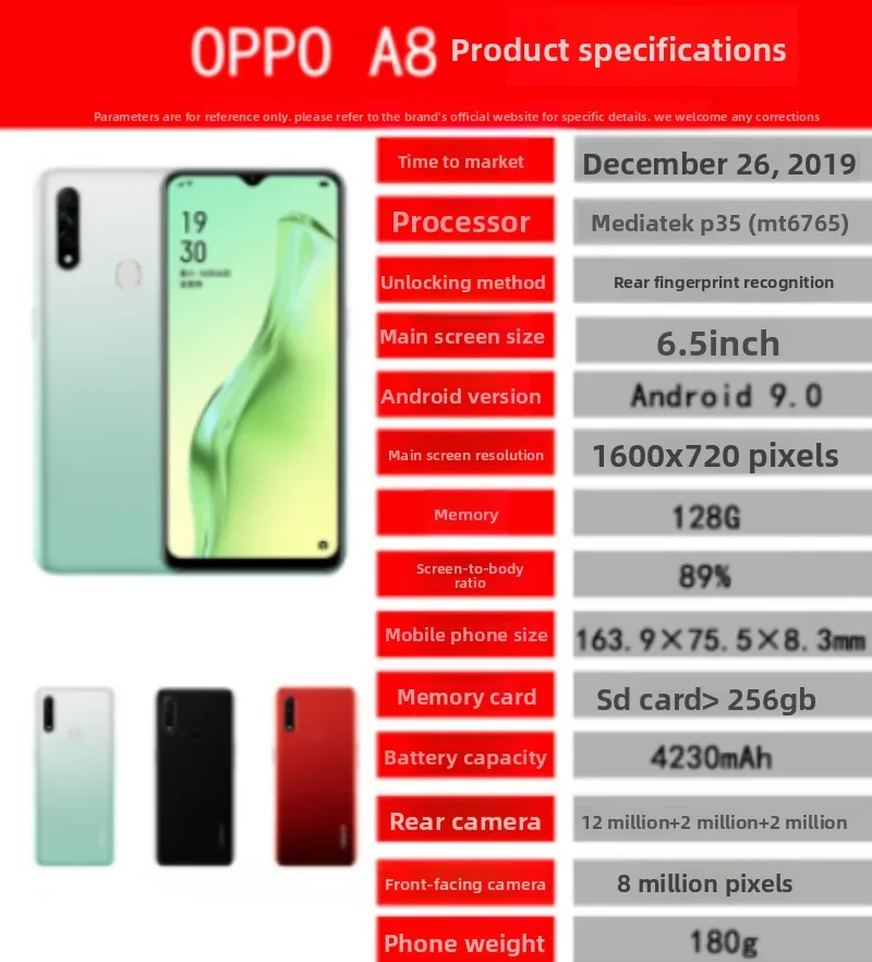OPPO A8 is a mobile phone released by OPPO on December 20, 2019. The following are its detailed parameters: