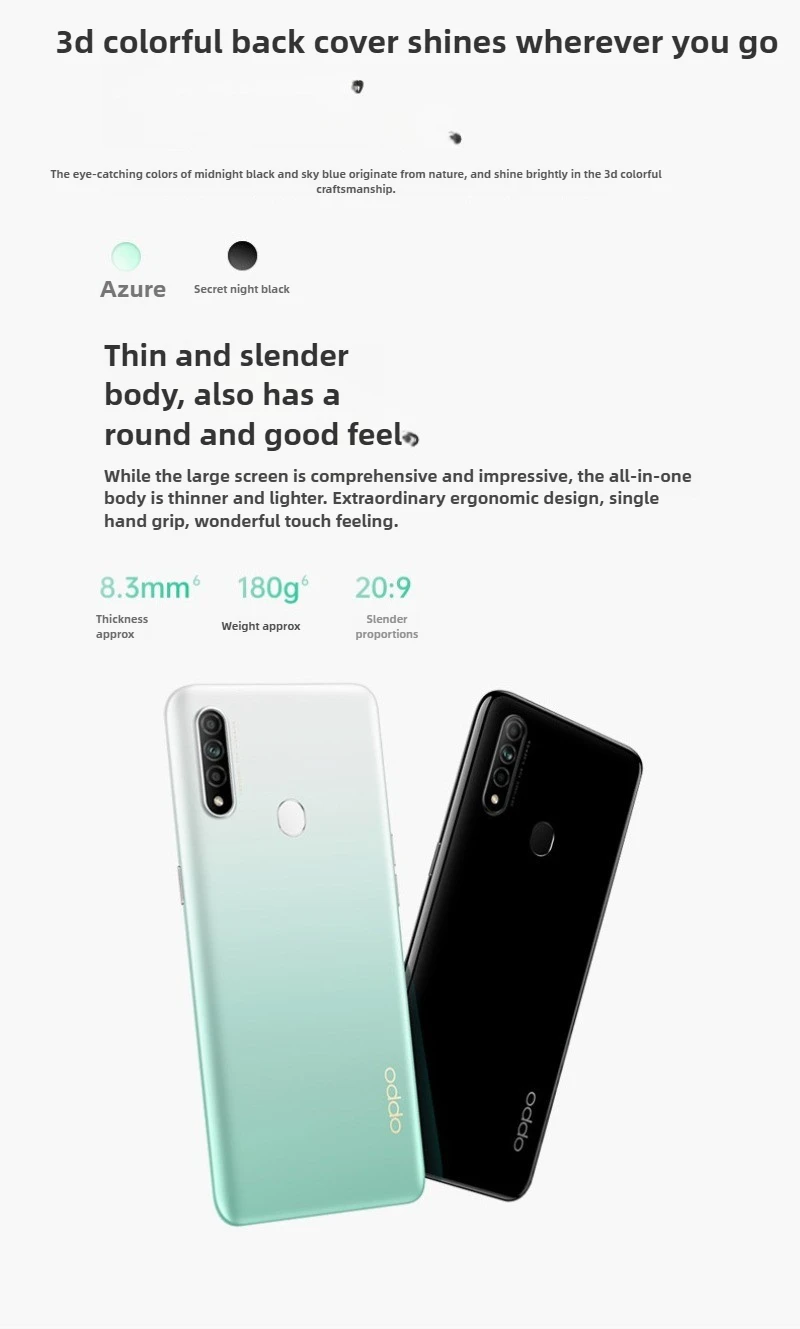 Appearance: Height is about 163.9 mm, width is about 75.5 mm, thickness is about 8.3 mm, weight is about 180 grams. It comes in three colors: Secret Night Black, Sky Blue, and Pomegranate Red, with a 3D colorful back cover design and a 6.5-inch TFT-LCD waterdrop screen on the front.