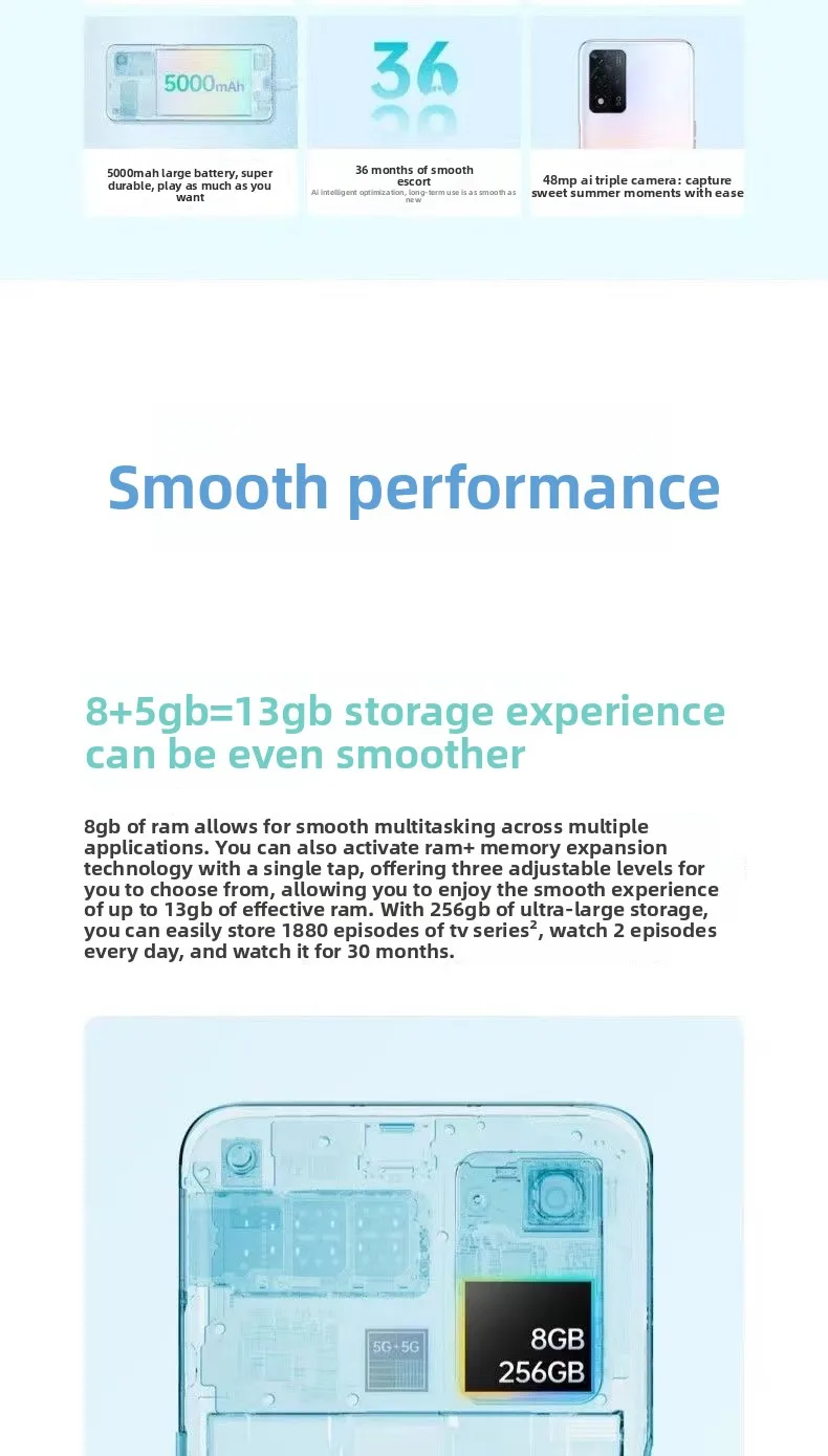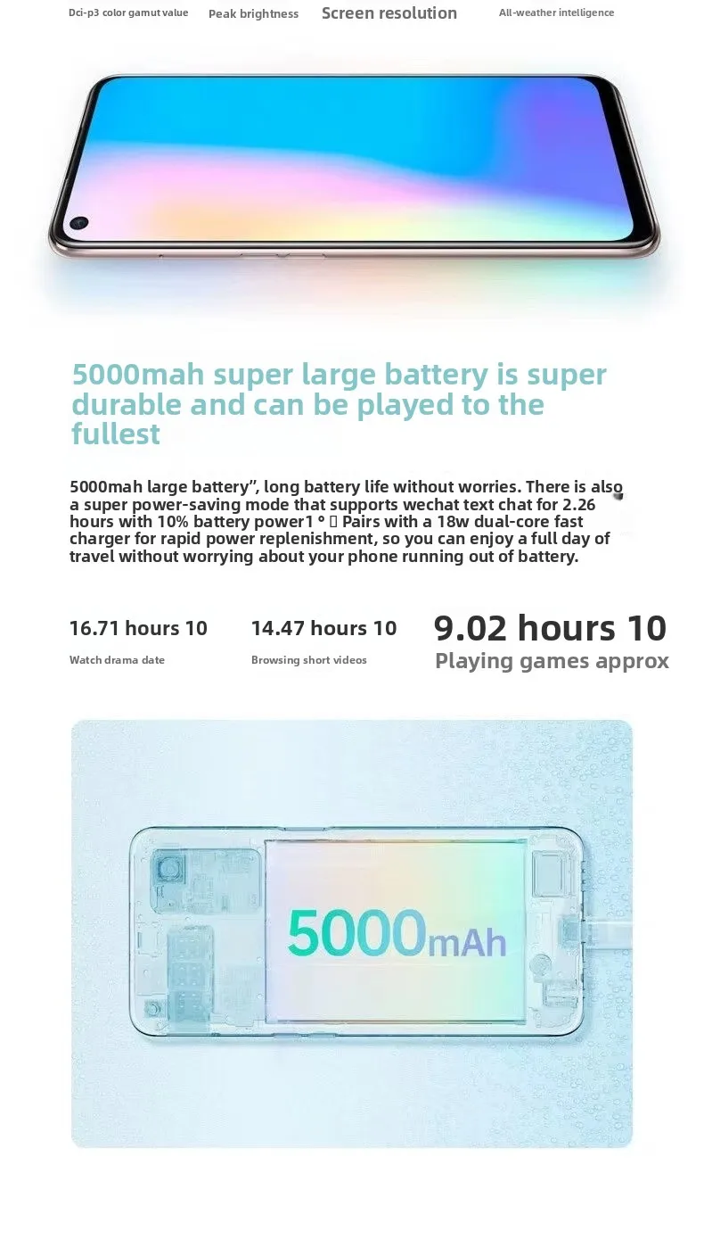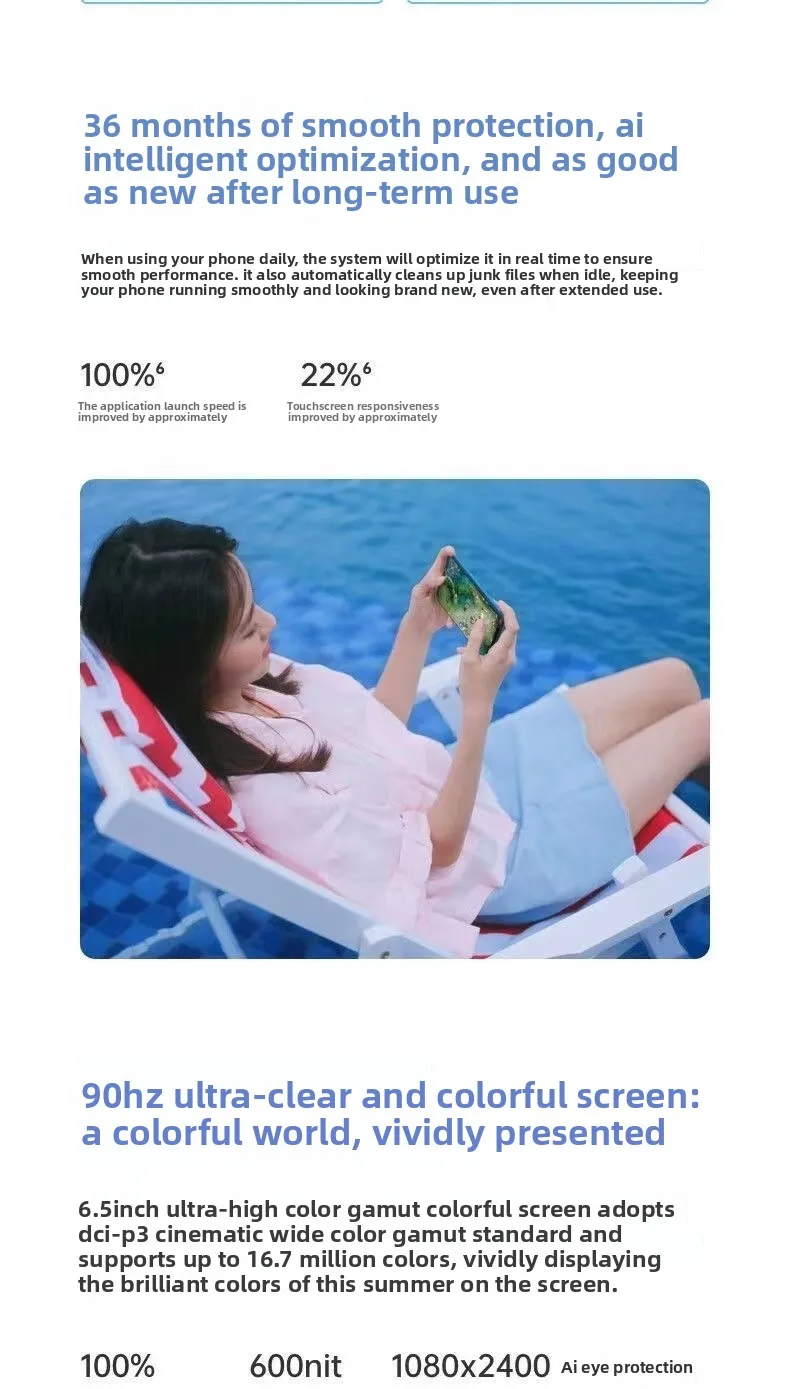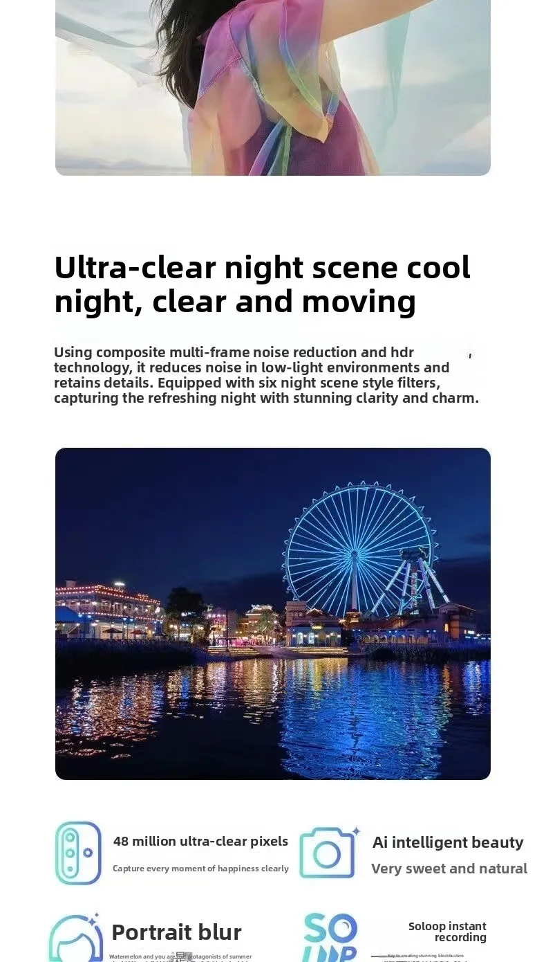 Shooting functions: Supports autofocus, panoramic shooting, anti-shake functions, etc. The front shooting modes include night scene, video, photo, etc., and the rear shooting modes include night scene, slow motion, professional, etc.