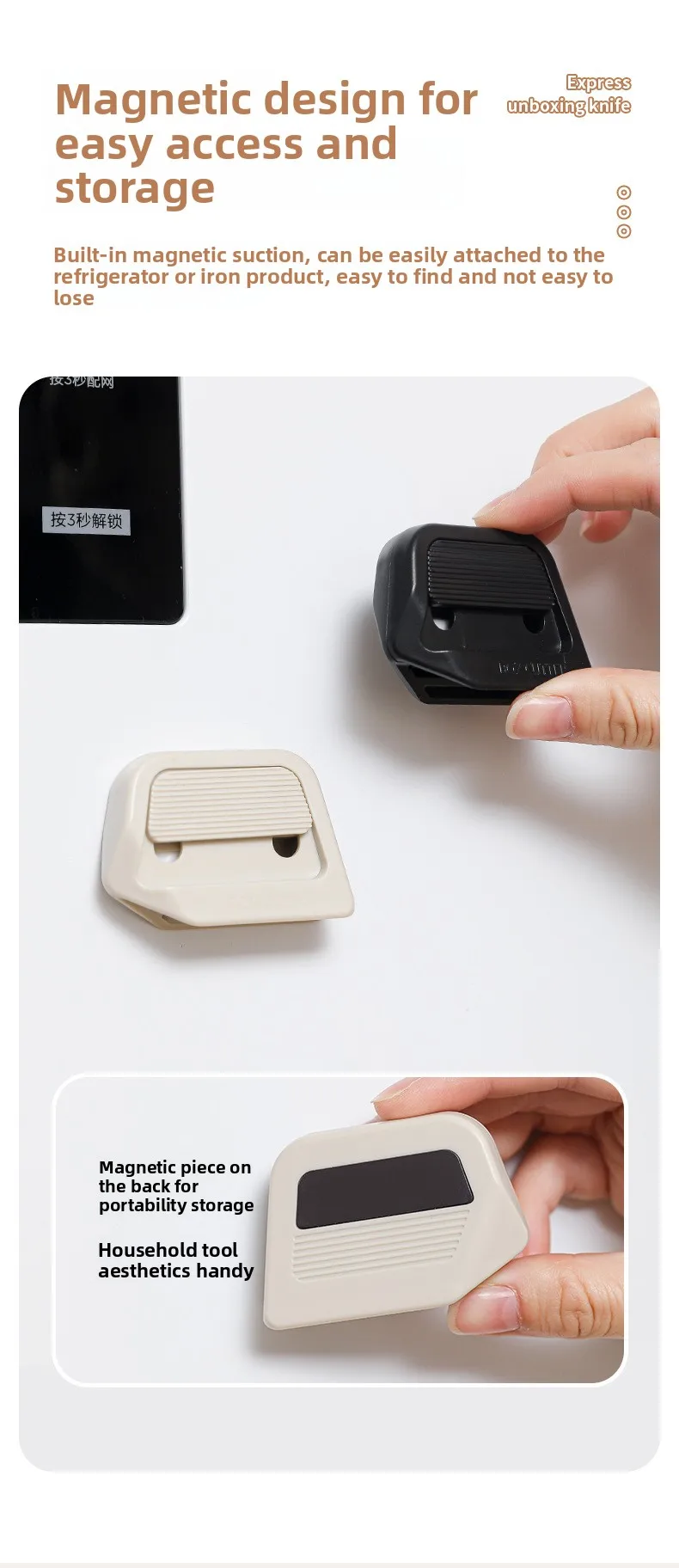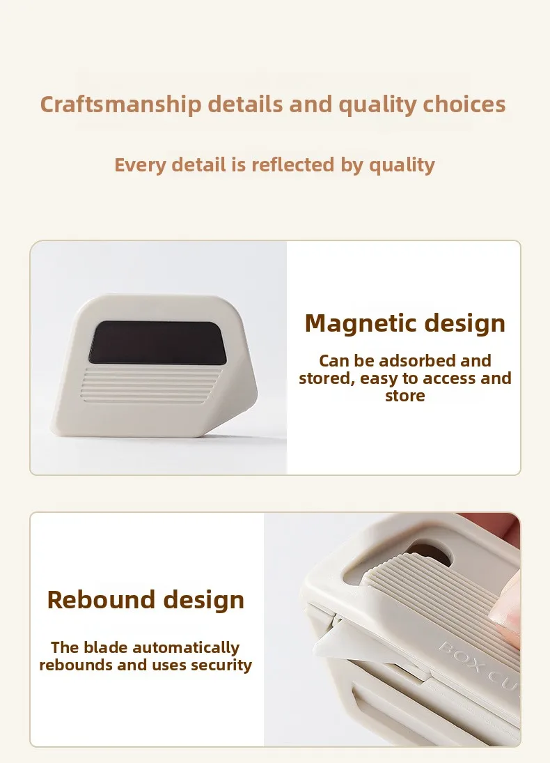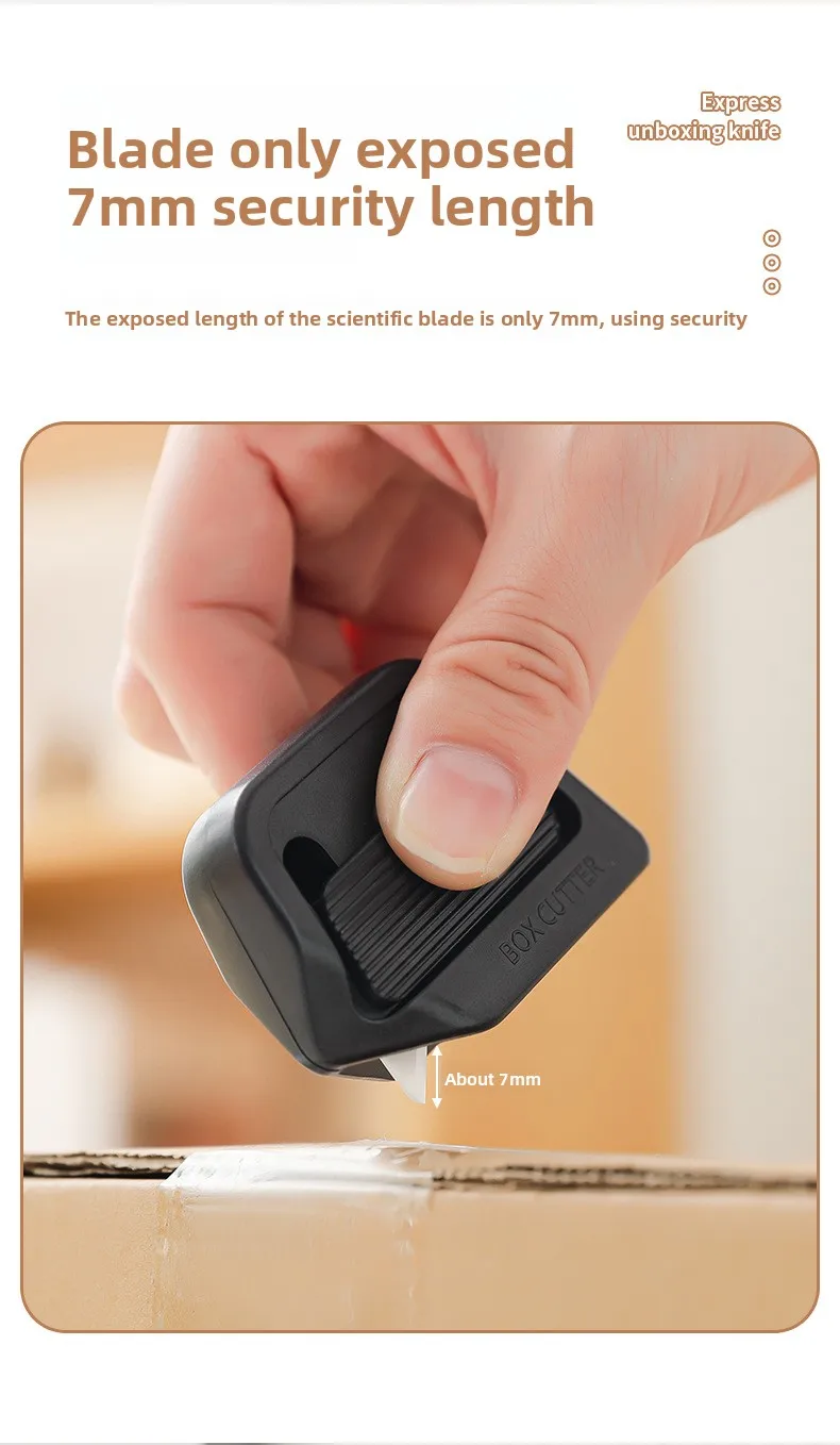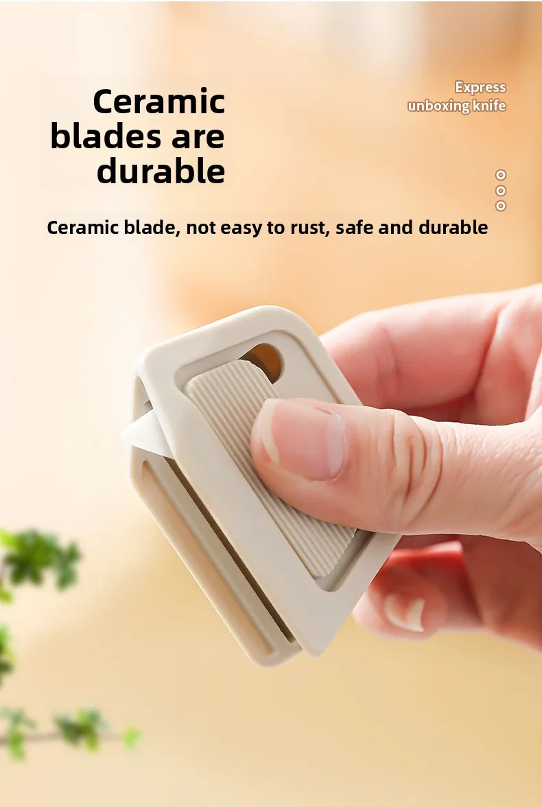 This art knife adopts an automatic rebound design. The blade is manually pushed and automatically rebounds after releasing the hand, which is safe, reliable and does not harm the hand. This art knife blade is made of ceramic material, which can easily cut various packaging materials such as tape, cardboard, plastic bags, etc. Moreover, the ceramic blade is not easy to rust and is durable. The blade design has a treatment groove, and when unpacking, the right angled groove fits the edge of the cardboard box. Pushing out the blade allows for smooth unpacking, ensuring that the built-in items are not damaged. The art knife has a built-in magnetic suction design, which can be easily attached to refrigerators or iron products, making it easy to store and not easily lost. The product shell is designed with hanging rope holes, which can be used to thread ropes and chains for easy carrying. When using the product, the blade is only exposed 7mm, making it safer to use.