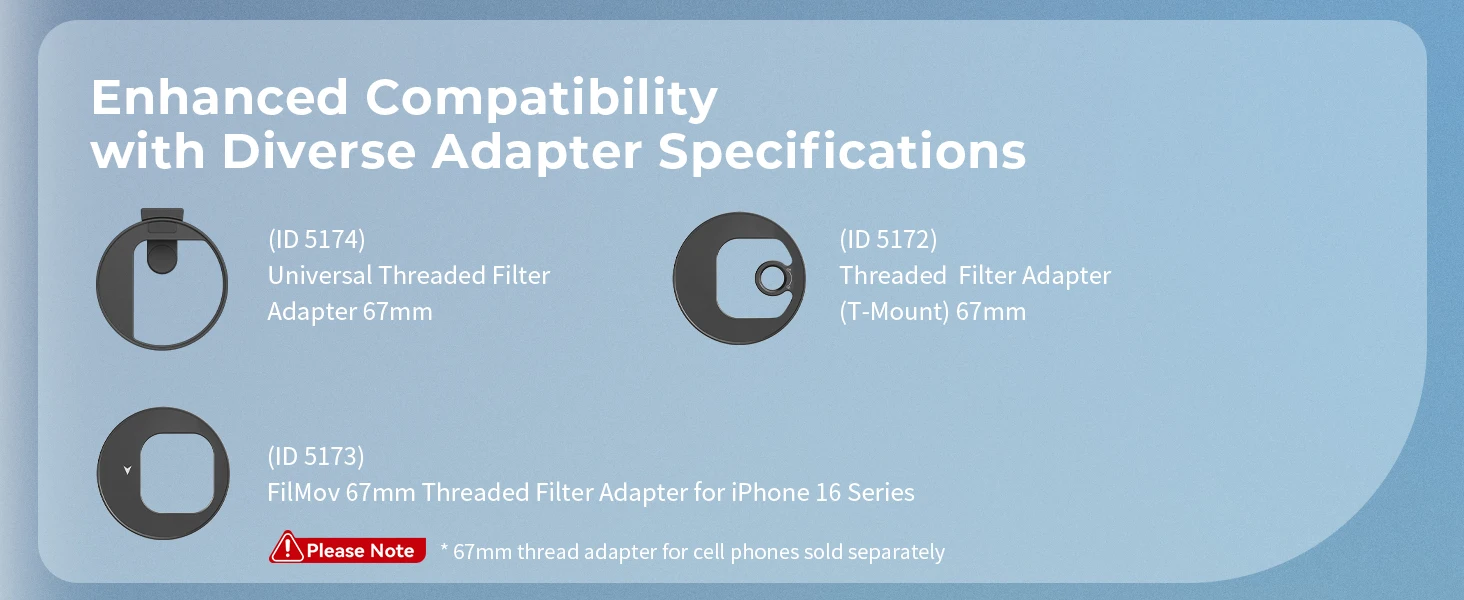 2.Compatible with SmallRig FilMov 67mm Threaded Filter Adapter for iPhone 16 Series 5173
