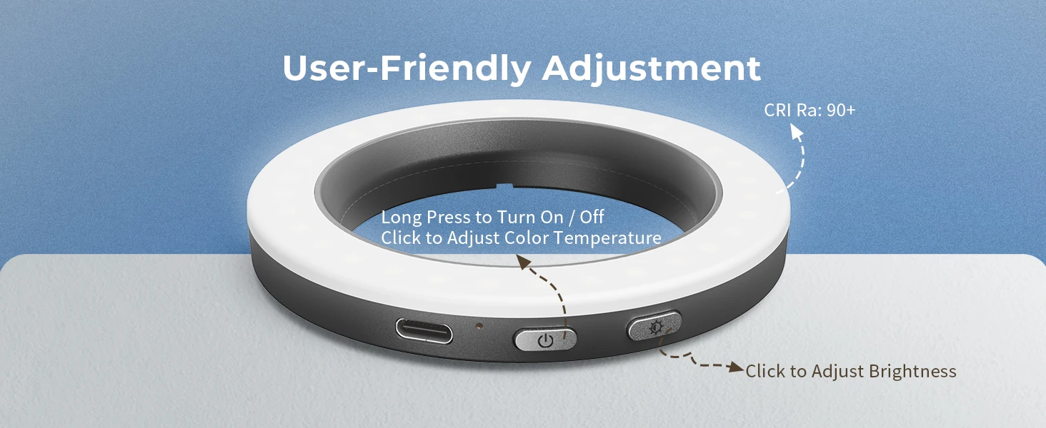 The video light features intuitive lighting controls, offering three adjustable brightness levels (33% / 66% / 100%) and three color temperature settings (warm yellow / warm white / cool white). The high-quality bi-color temperature light source ensures a high color rendering index and accurate color reproduction. The soft ring light enhances eye highlights, adding depth and life to a subject’s eyes, making them more engaging and expressive. It also provides a wide illumination range with even lighting, eliminating shadows on the face, and enhancing the skin and eyes for a beautifying effect.
