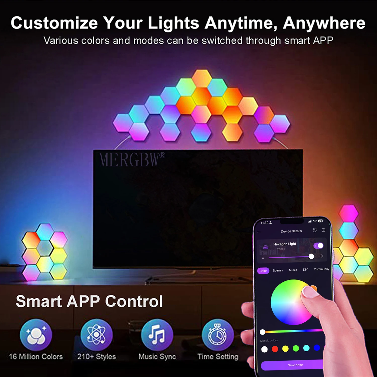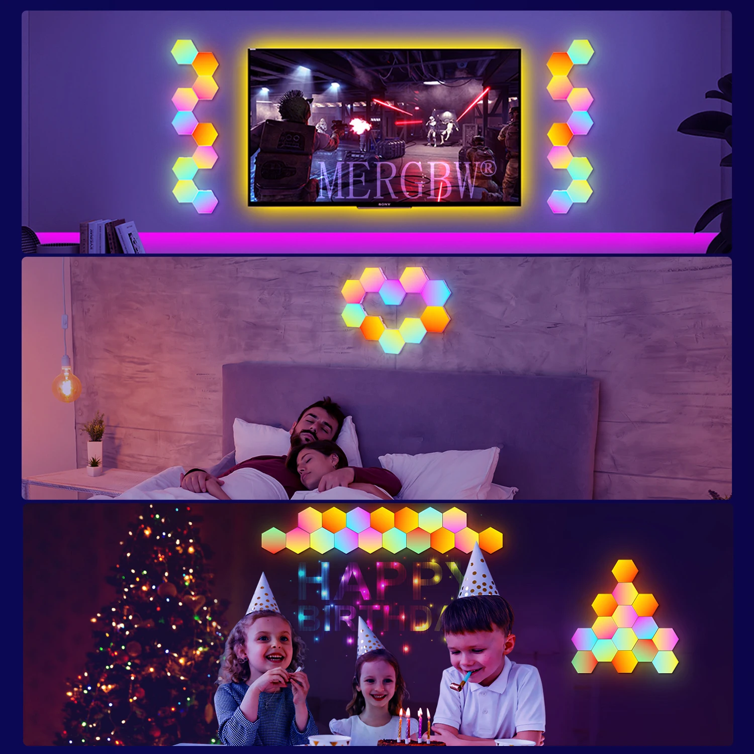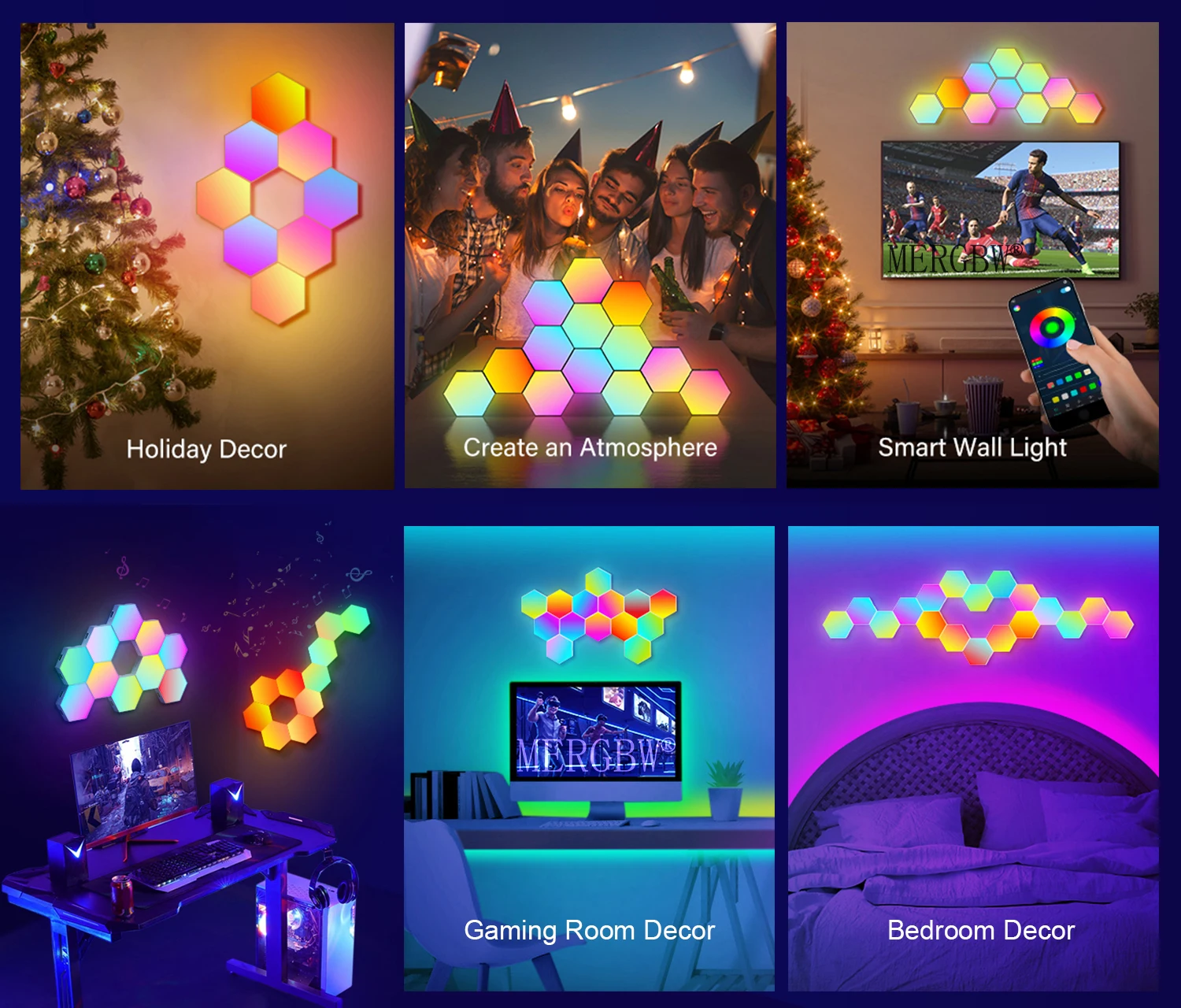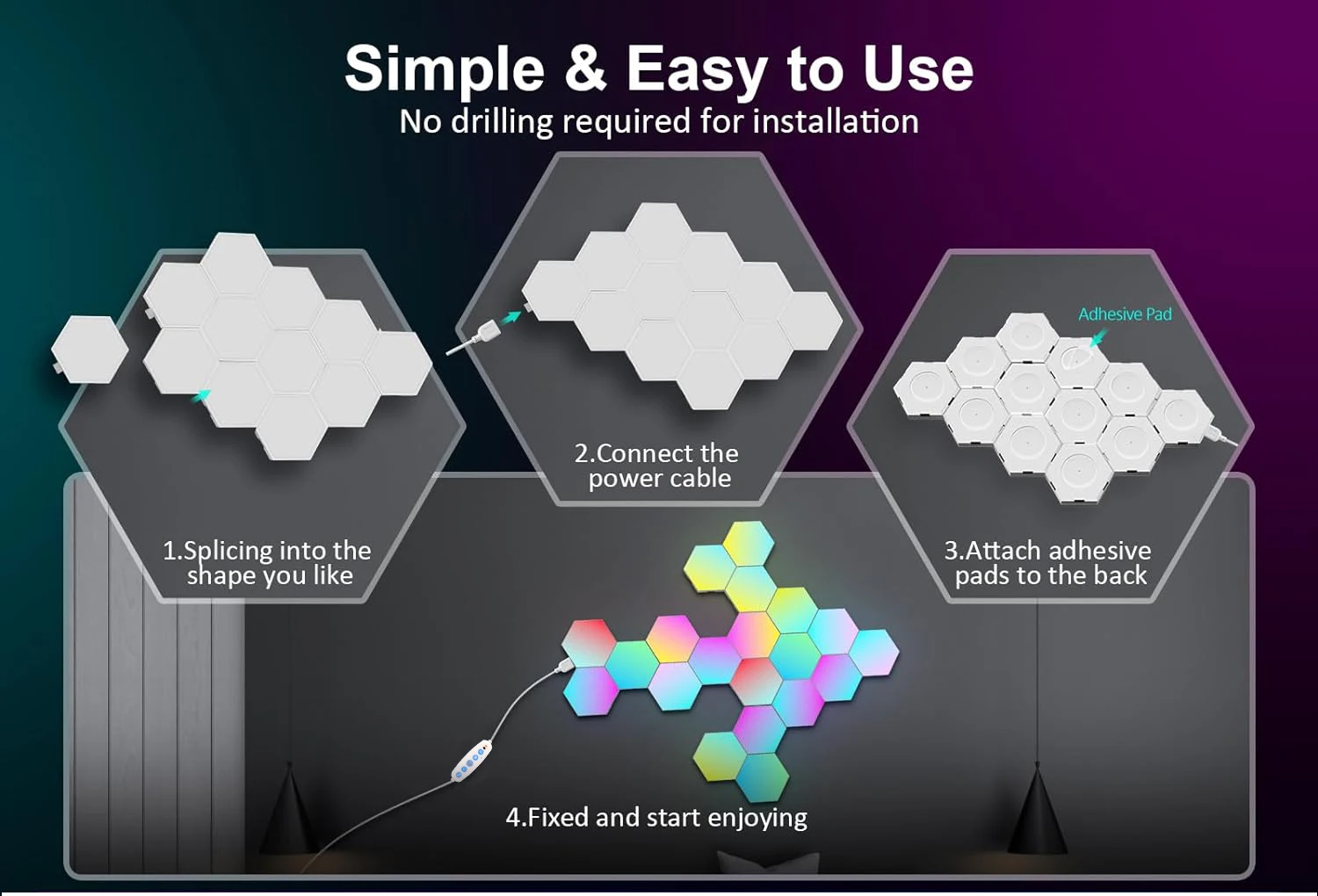Smart APP and Remote Control: Install the matching APP on your mobile phone, you can turn on/off the hexagonal led light, change the color, adjust the brightness to get the effect you want through the mobile APP, the operation is simple. Over 16 million colors can be switched at will to enhance the ambience. At the same time, the hexagonal light is equipped with a remote control that provides you with double protection and is more convenient for daily use.