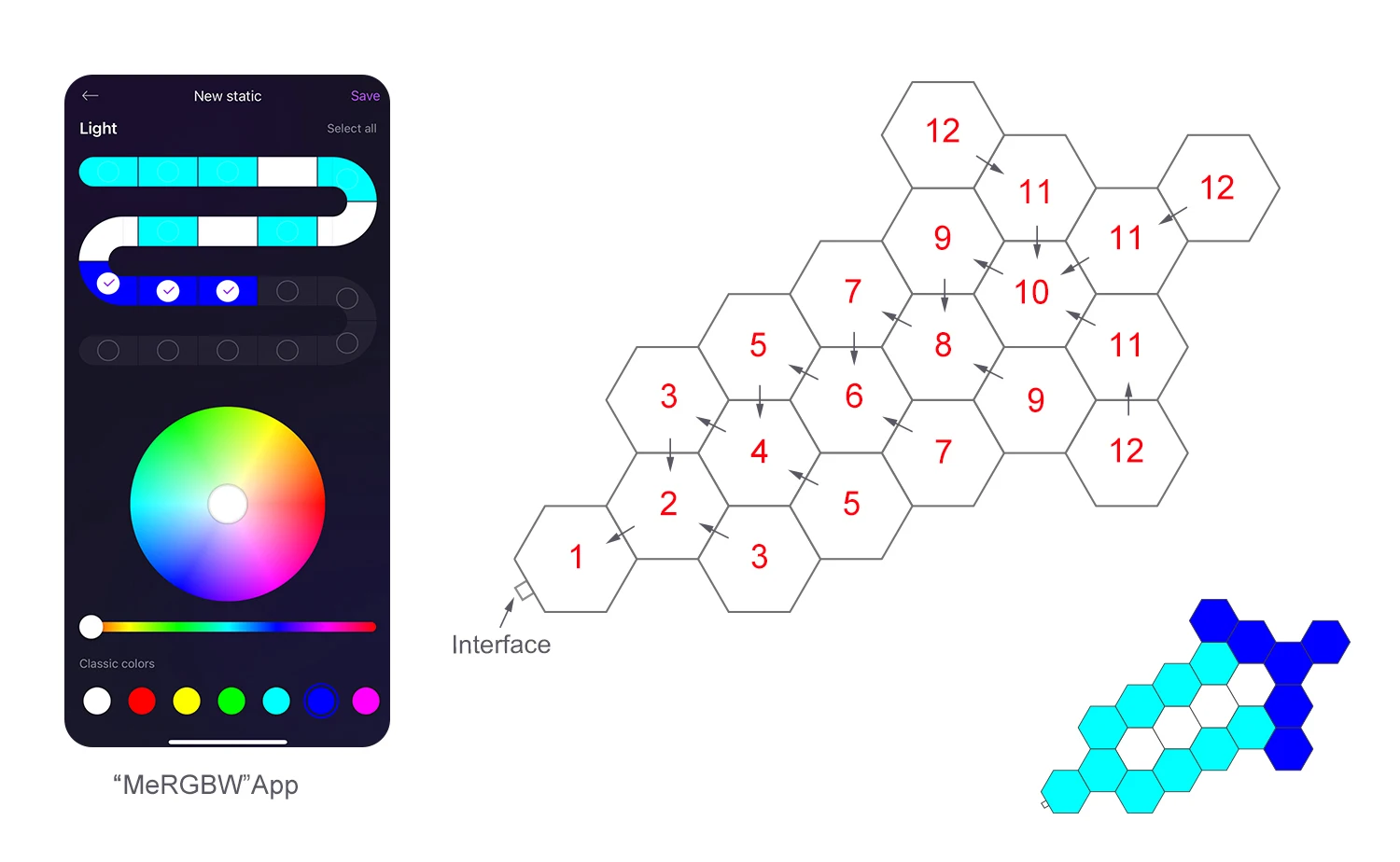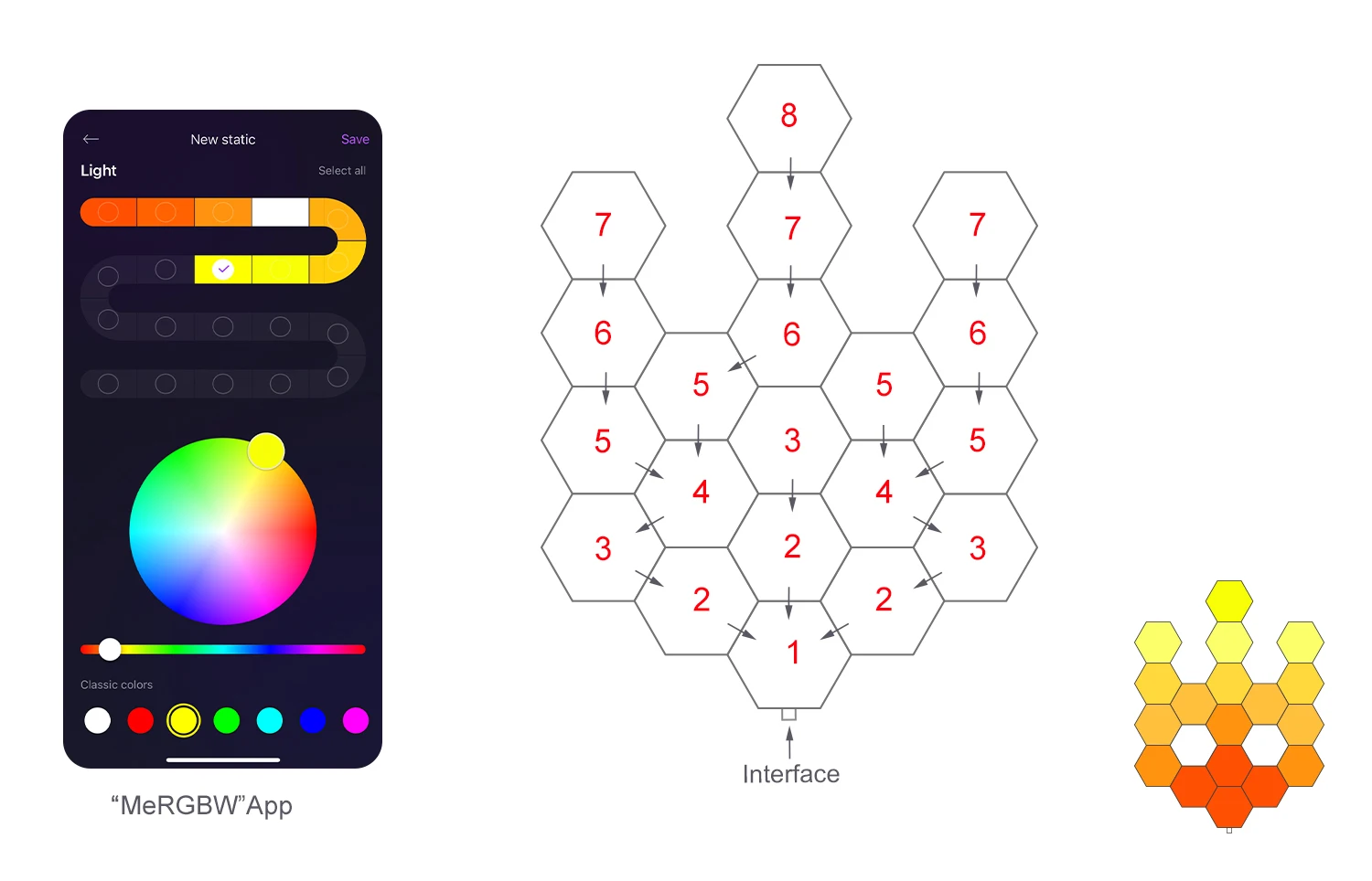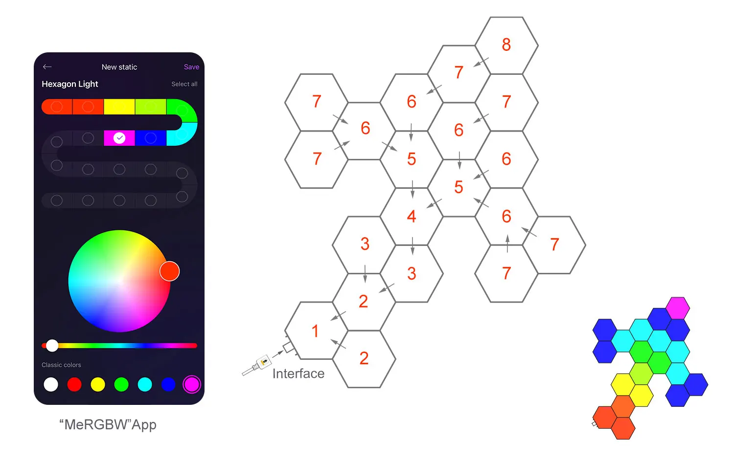 Rich Animated Effects: Select from animated multicolor scene effects based on nature, holidays such as New Year and more. MeRGBW App intelligently recognizes the position of hexagon lights for seamlessly flowing rainbow-like effects across your entire design.