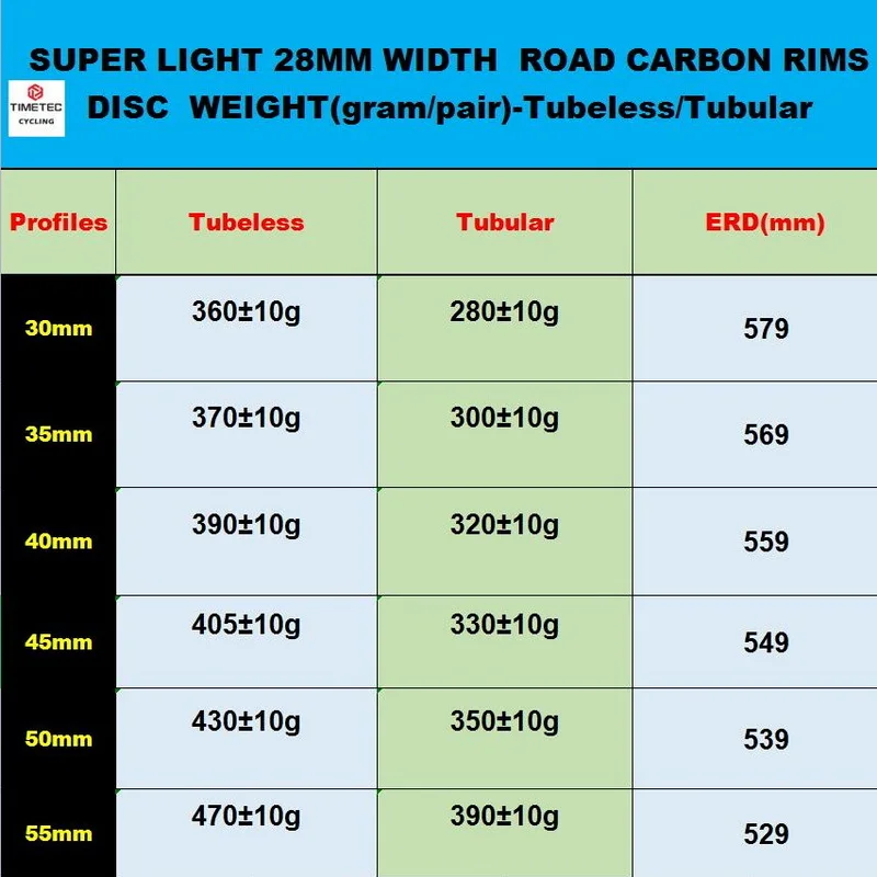 Rims weight tubular: (Rims weight base on UD carbon weave, other carbon weave will be 15-20 gram more)