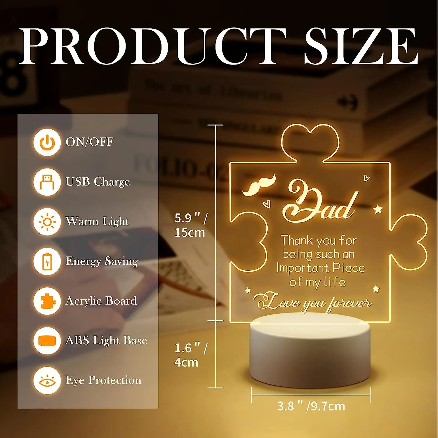 7. Advantages: Acrylic plate and lamp holder larger size than 90% of other 3D lamps/highest quality circuit board/optimized details and 3D pattern design/LED light gentle and uniform, no glare, no flicker, adjustable light, harmless to children’s eyes.