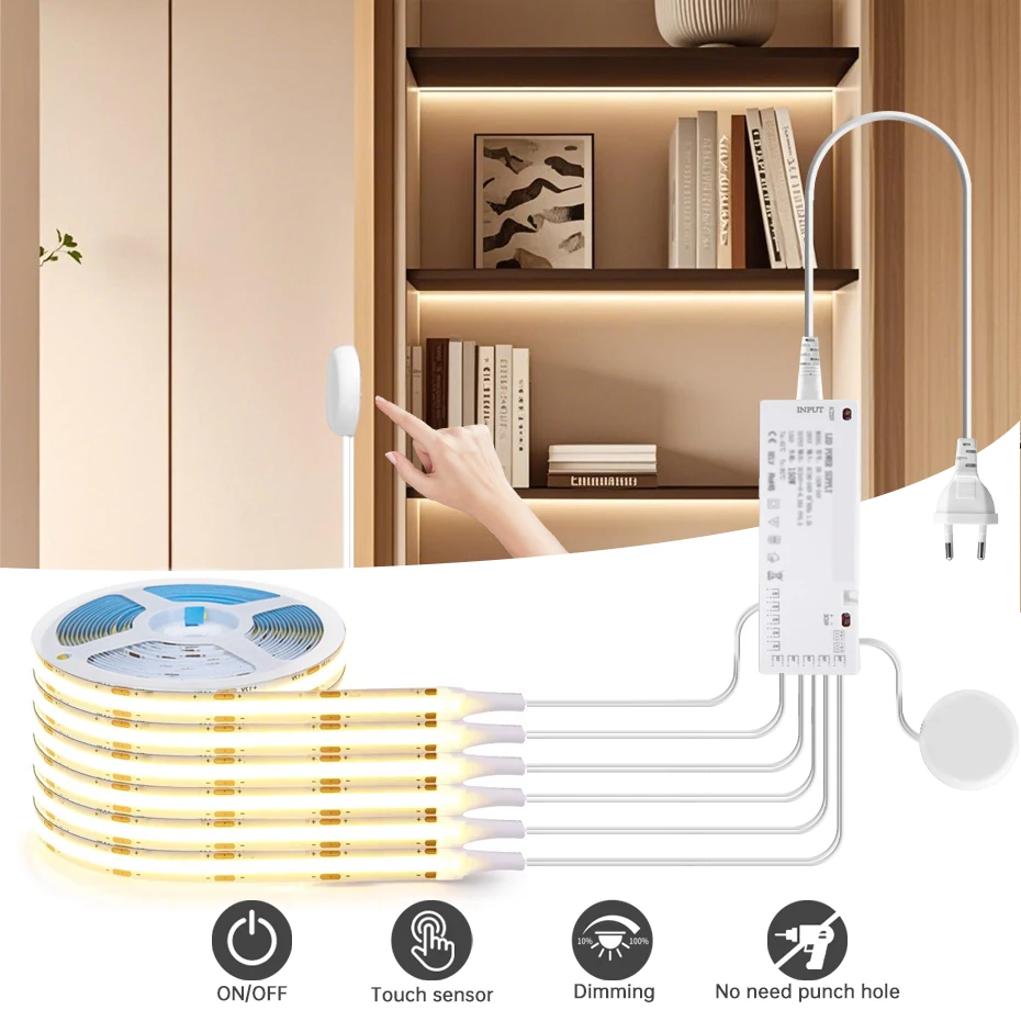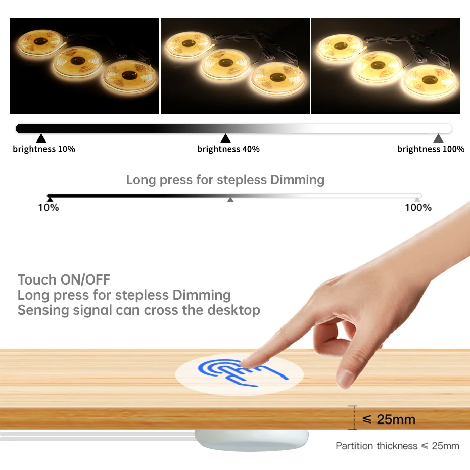 1.The touch dimmer control sensor switch is used behind wood board (like kitchen cabinet ,wardrobe, closet..) or glass mirror. It can work on DC12V led light, And it more flexible to stick anywhere you like,simple and easy to install. DON’T NEED OPEN HOLE!!!