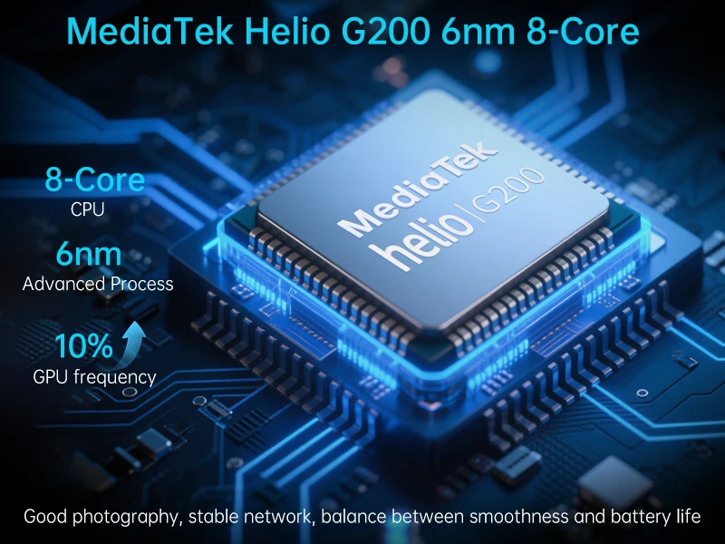 • CPU: MediaTek Helio G200 6nm 8-Core CPU