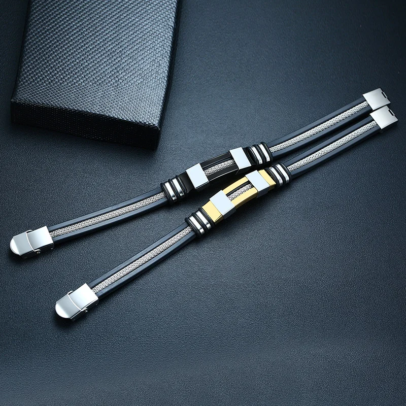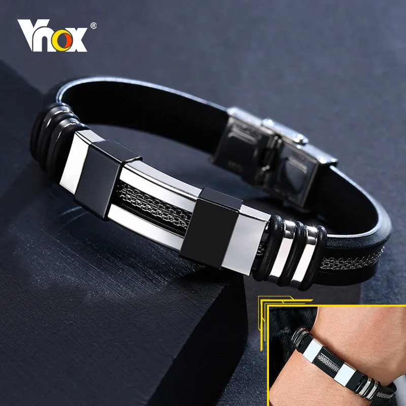 Vnox Stainless Steel Bracelet Men Wrist Band Black Grooved Rudder Silicone Mesh Link Insert Punk Wristband Stylish Casual Bangle