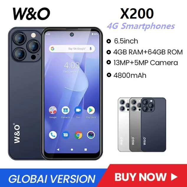 W&O X200 Cheap 4G Smartphones Quad Core 4GB+64GB 6.53Inch HD+ Display Android 10 Mobile Phone 13MP 4800mAh Battery With Headset