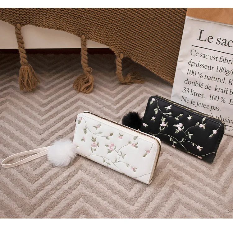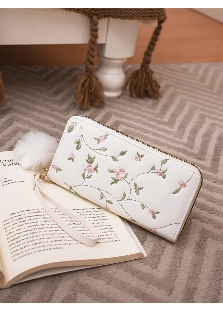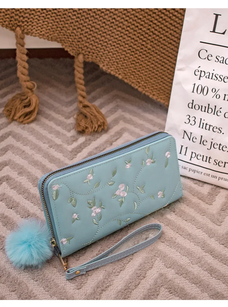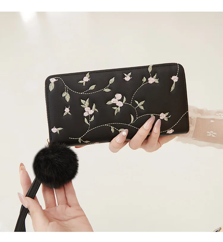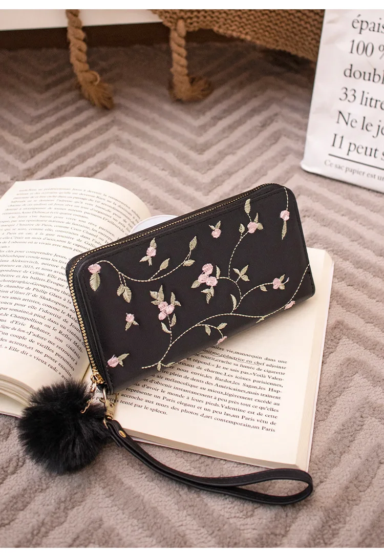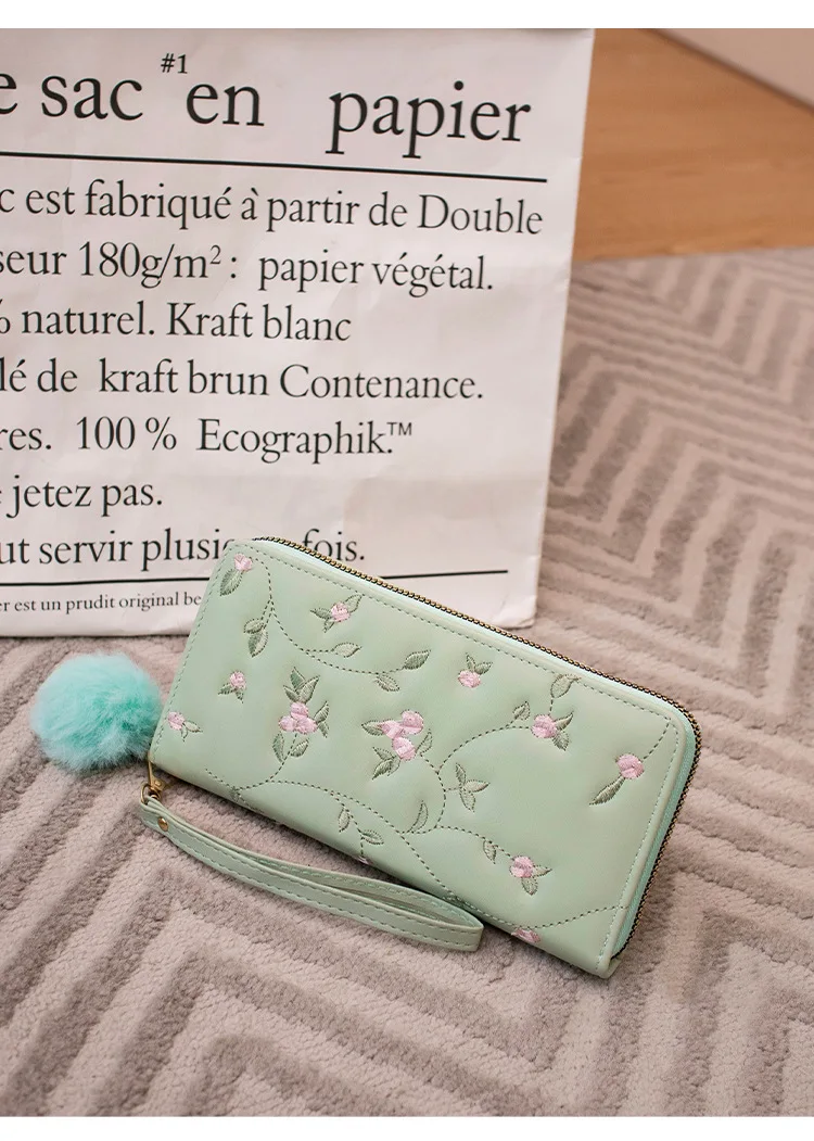 Women’s Embroidered Long Wallet PU Leather Flower Pattern Ladies Coin Purse Card Holders Foldable Zipper Money Bag Mom Wallets