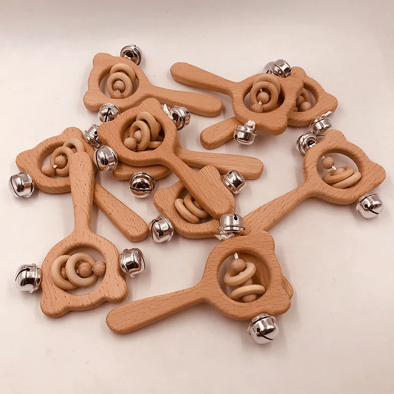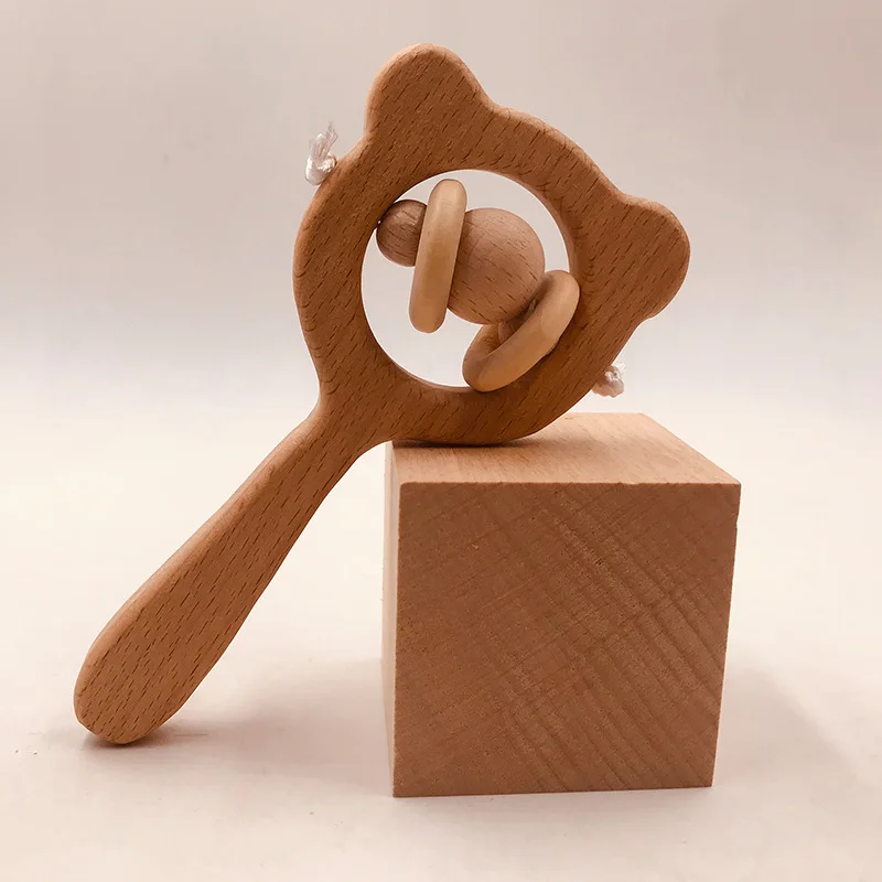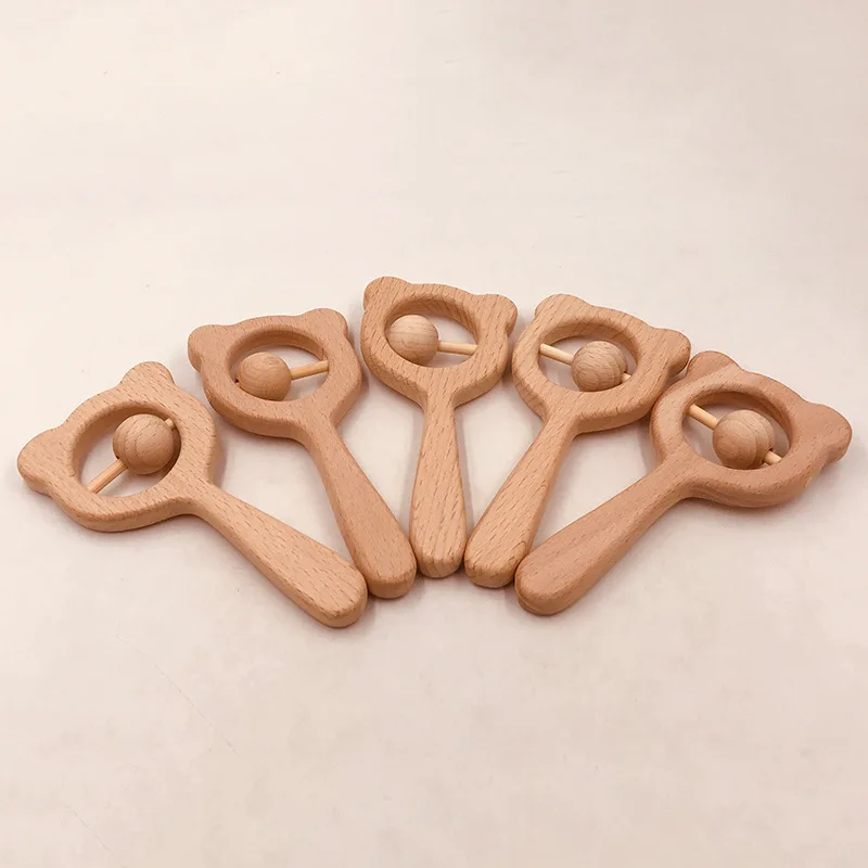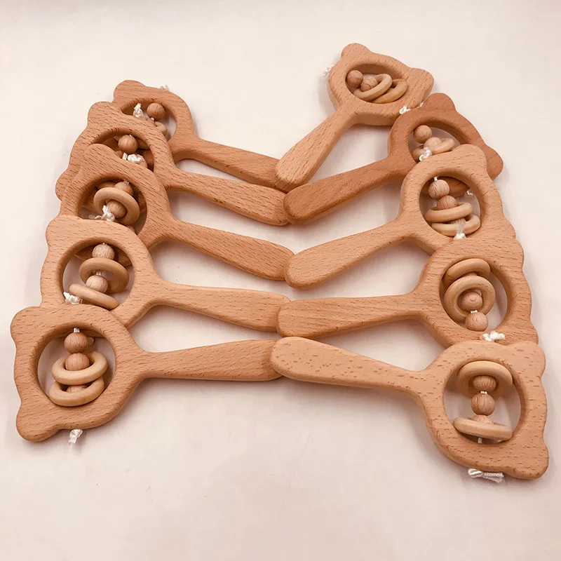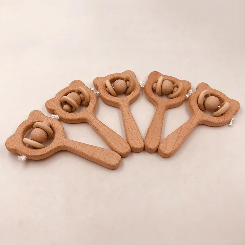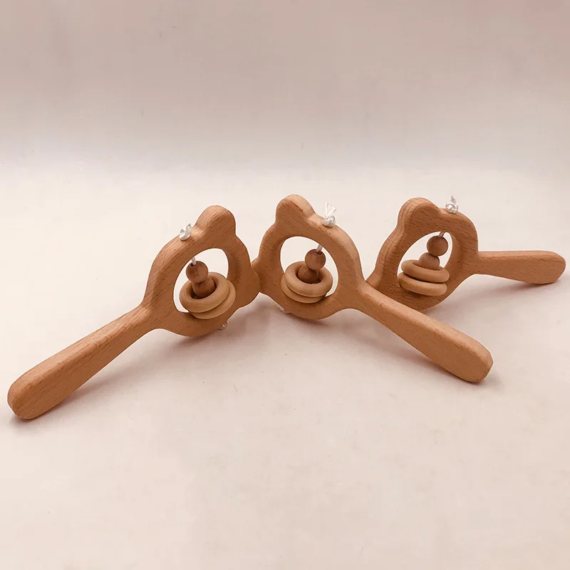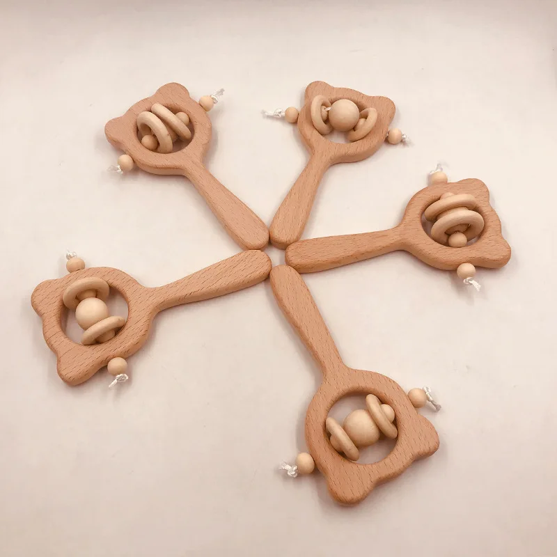 Wooden Rattle Beech Bear Hand Teething Wooden Ring Baby Rattles Play Gym Montessori Interactive Toys for Kids Educational Toys