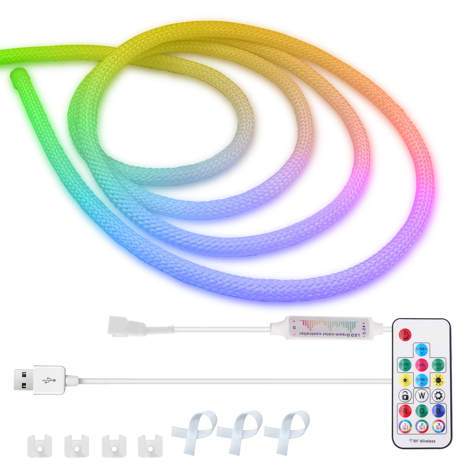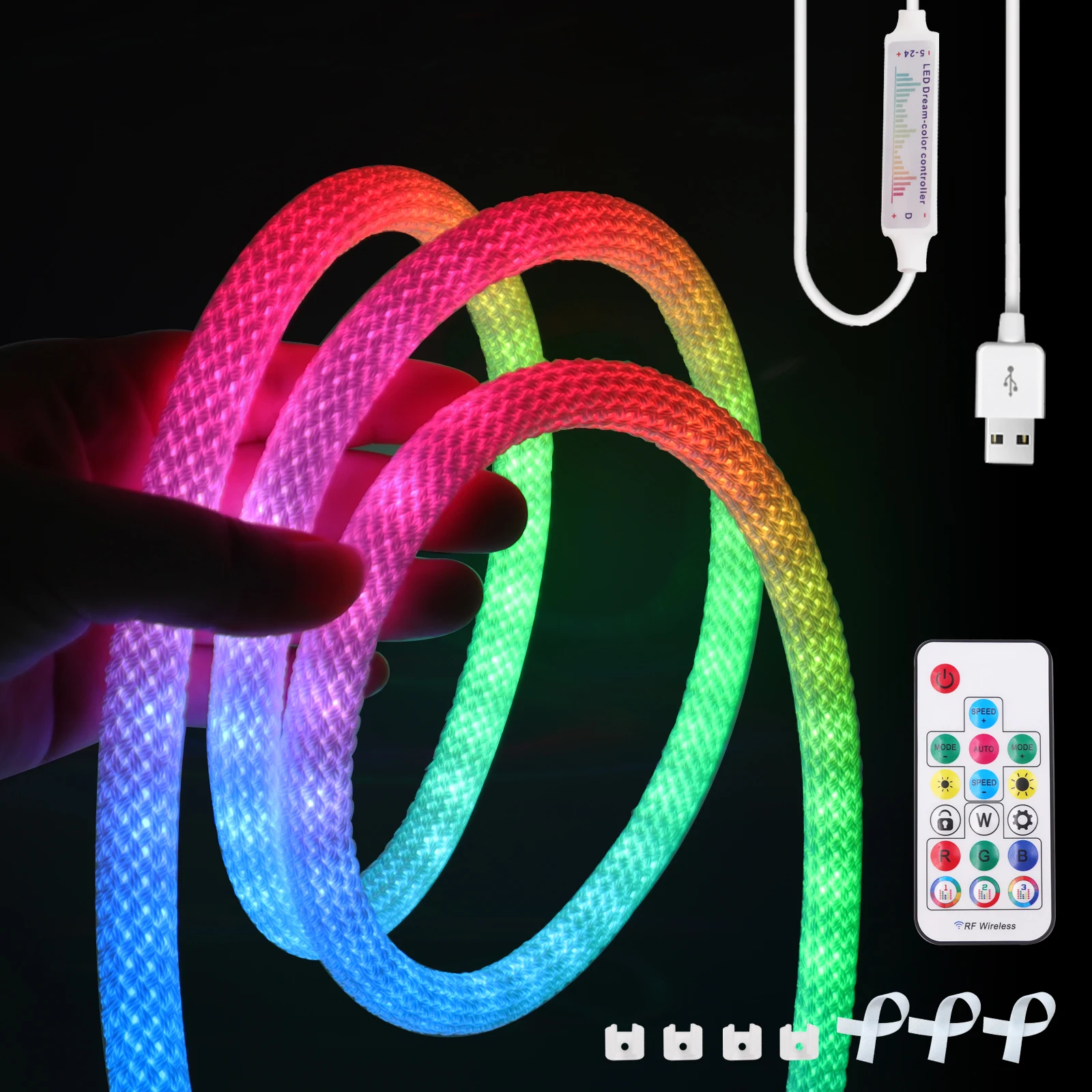 2.USB RF control :1×led strip1×RF remote1×USB cable ( no power supply)2 x Plastic Clip Per Meter.