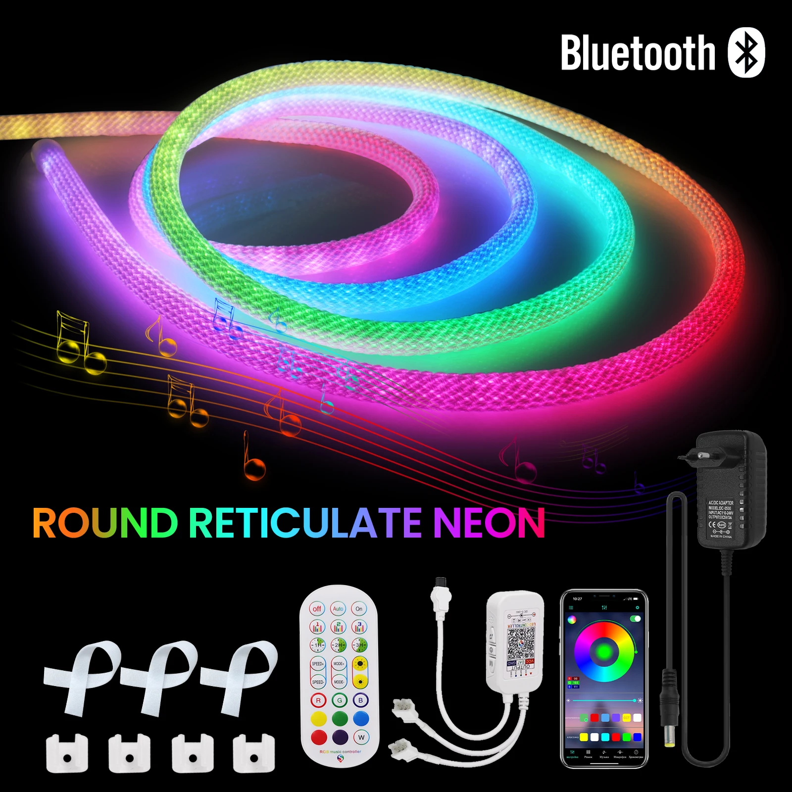 5.Bluetooth EU/US/UK/AU set:1×led strip1×power supply1×bluetooth controller1×24Keys remote (no battery)2 x Plastic Clip Per Meter.