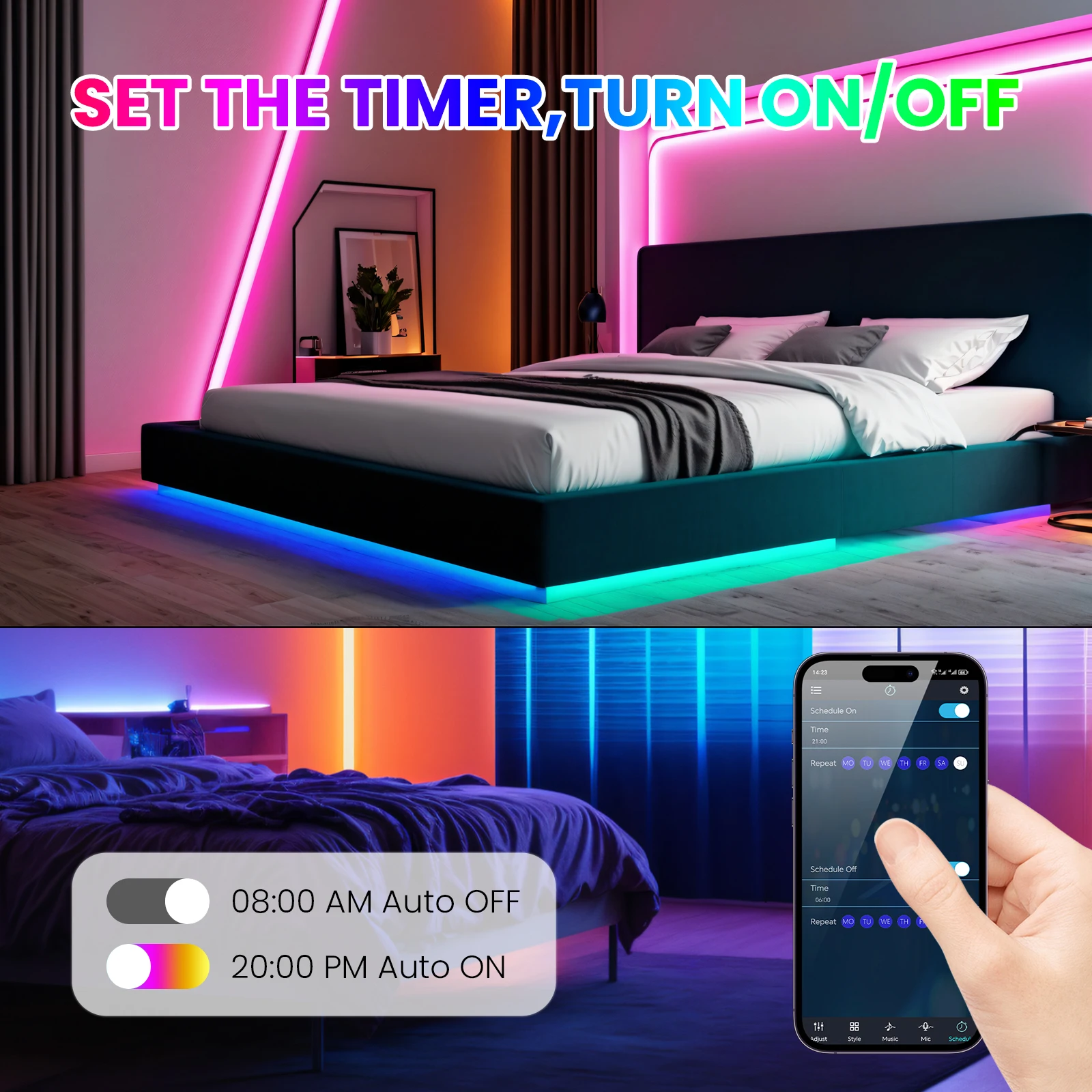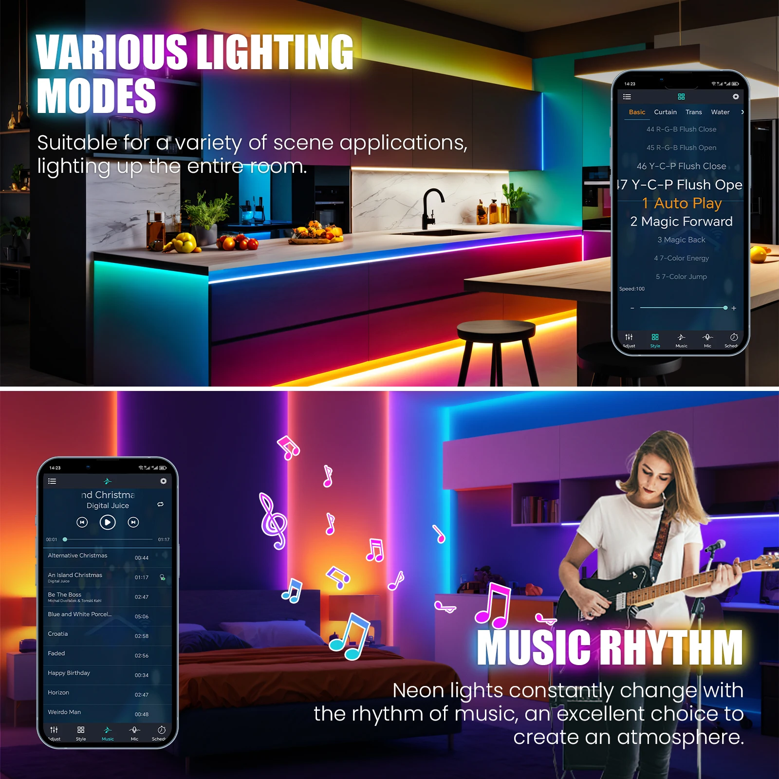 -APP selects the music sync mode, which changes the color and sound.