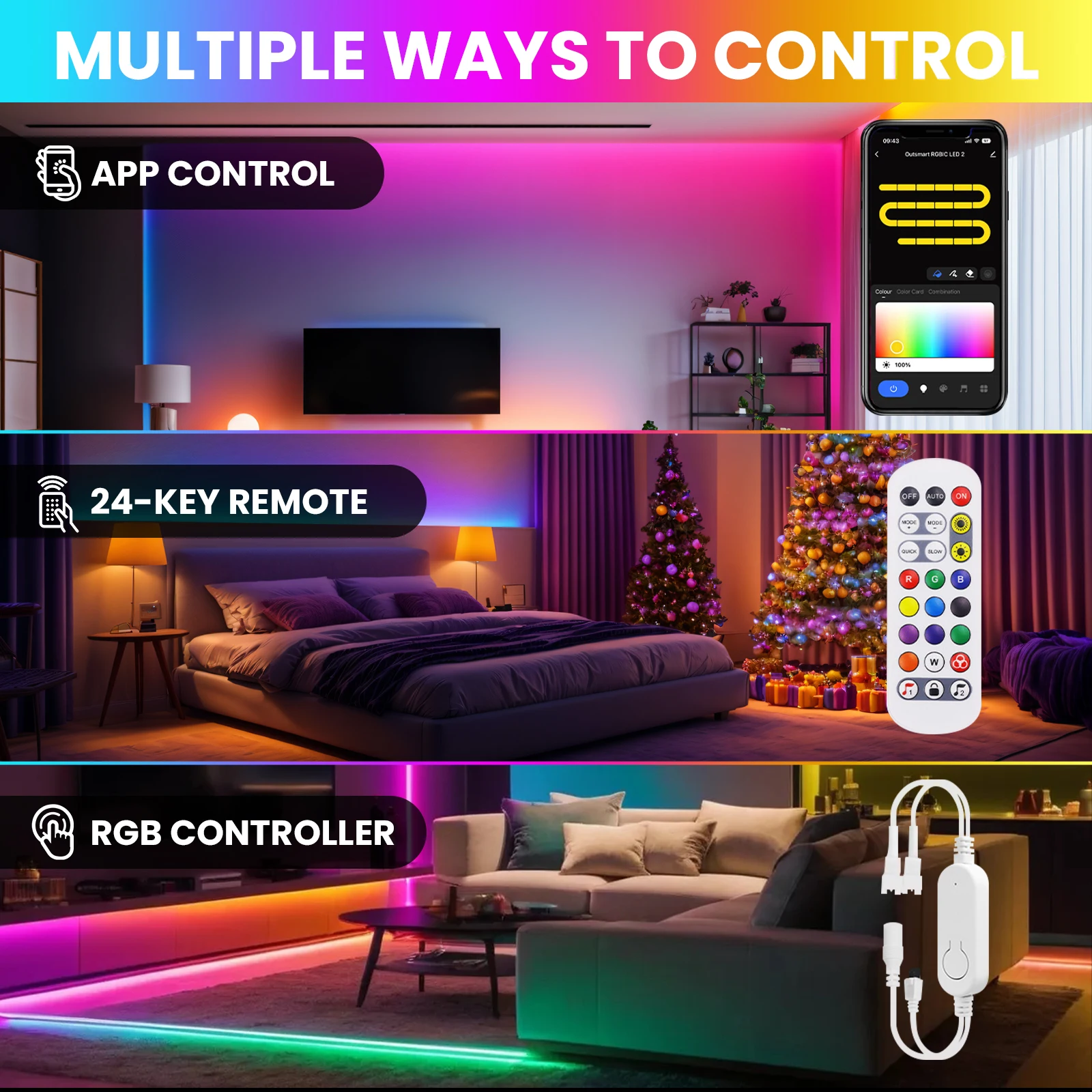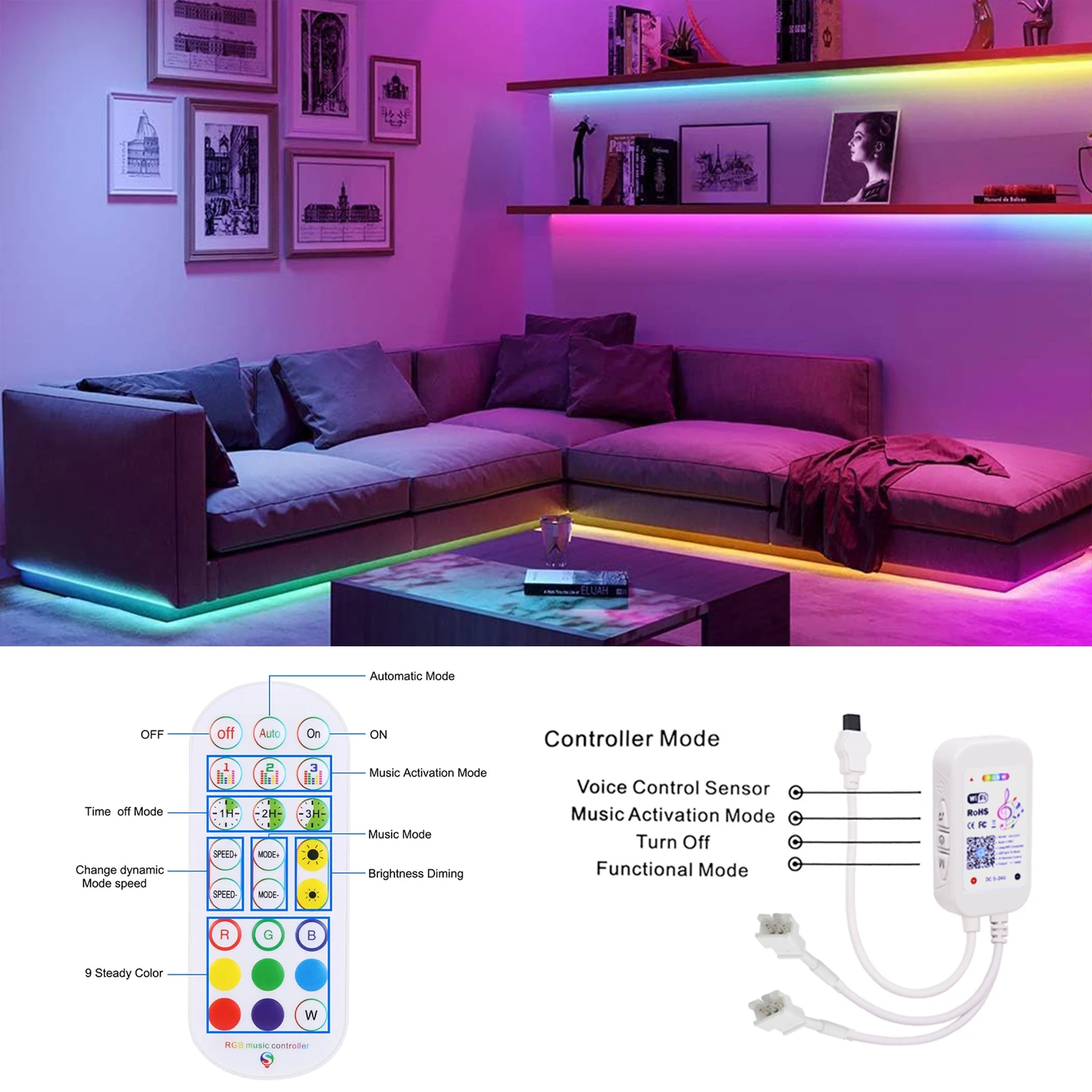 3.USB Wifi set:1×led strip1×USB cable ( no power supply)1×24Keys remote (no battery)2 x Plastic Clip Per Meter.