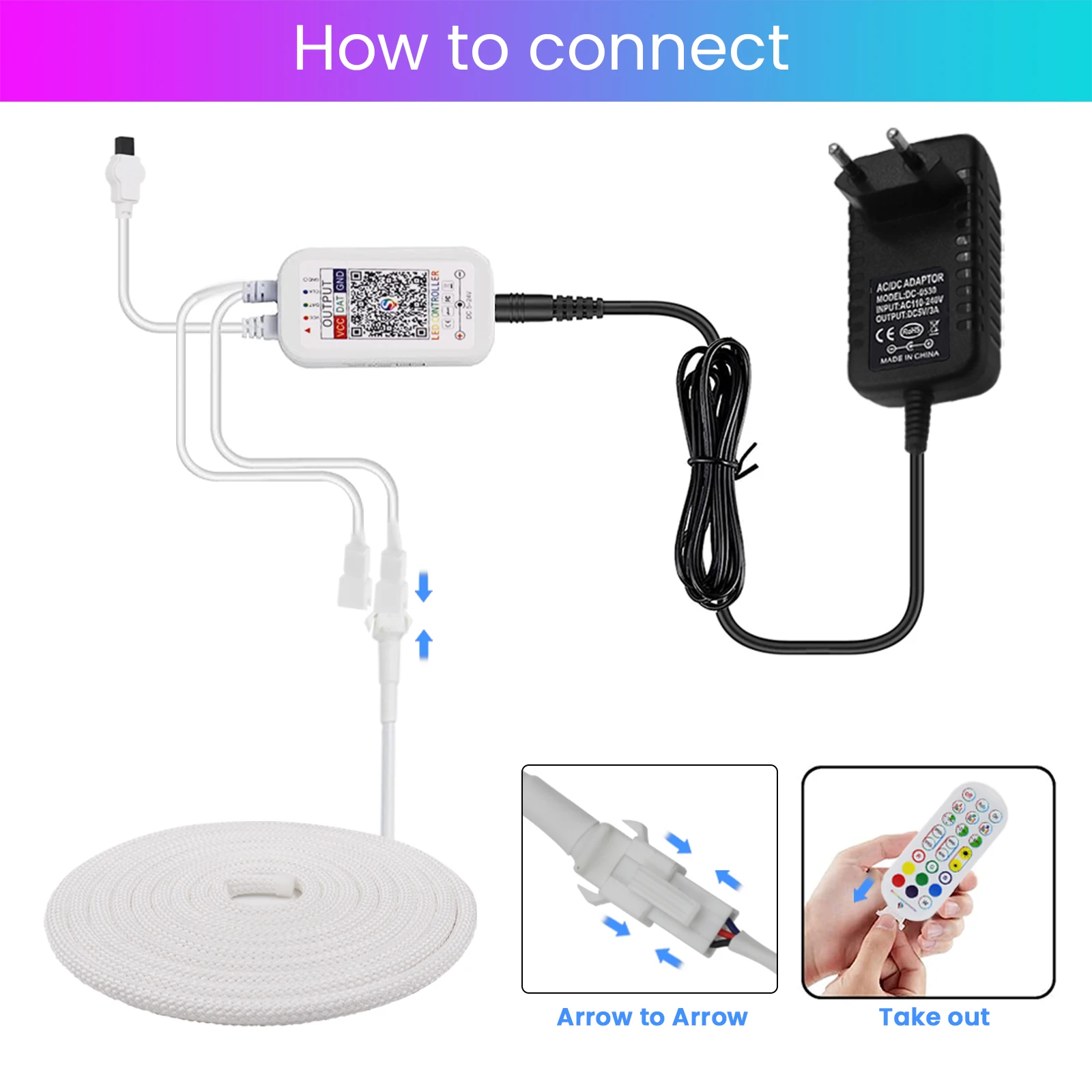 -Connect LED color strip and controller, power on controller