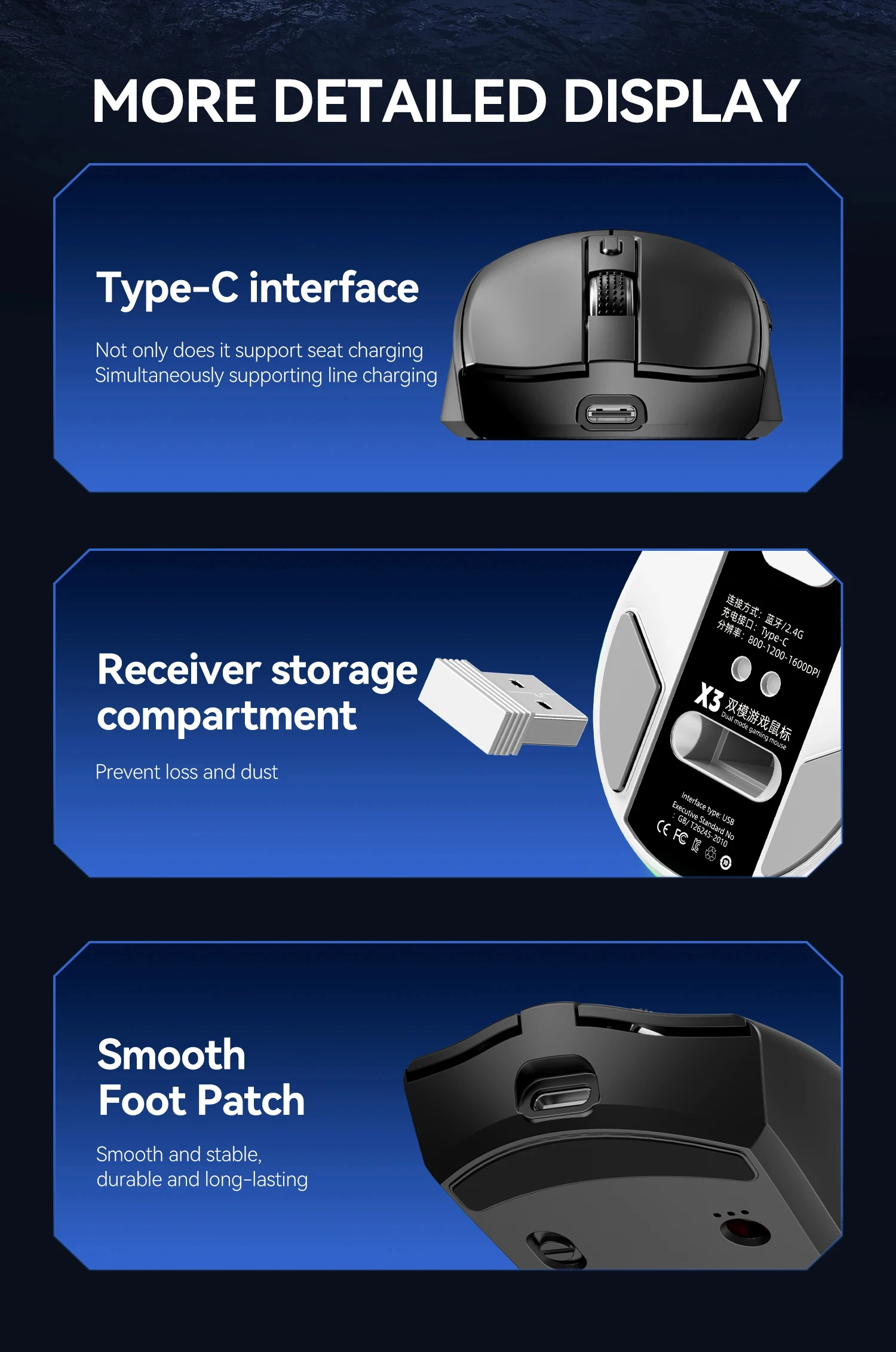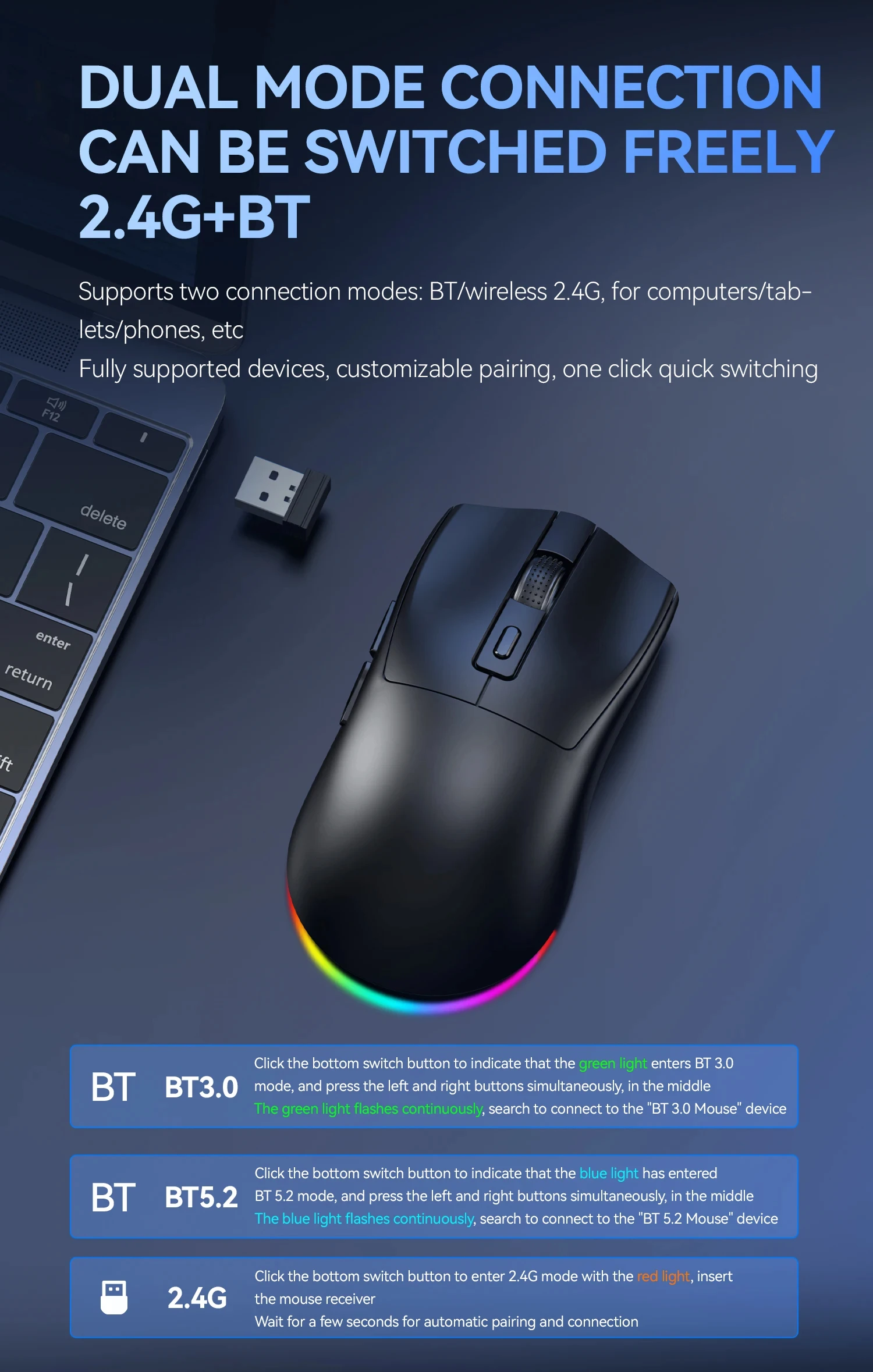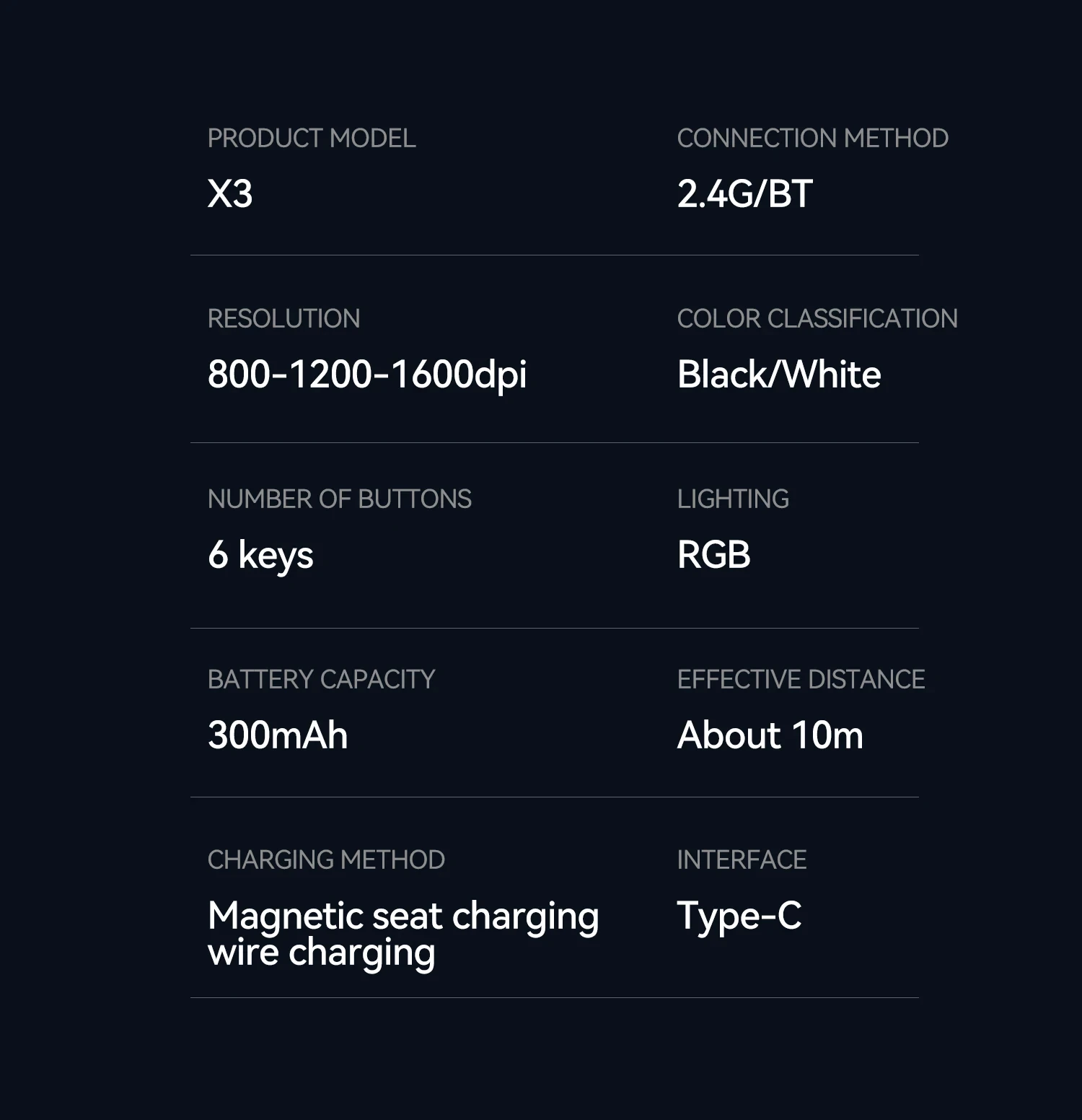 Product Feature:✨ DUAL MODE CONNECTION CAN BE SWITCHED FREELY2.4G+BT:Supports two connection modes: BT/wireless 2.4G, for computers/tablets/phones, etc .Fully supported devices, customizable pairing, one click quick switching.✨ RGB MAGNETIC CHARGING BASECHARGE AS YOU GO:Exclusive RGb luminous magnetic charging base, equipped with USB expansion port Can be connected to a mouse receiver for wireless connectivity.✨ 3-SPEED DPI ADJUSTABLE PRECISE REGULATION:800-1200-1600DPl,Suitable for various scenarios Bringing different smooth experiences.✨ 300mAh CAPACTY BRING STABLE BATTERY LIFE:Built in 300mAh capacity charging, paired with a low-power solution Longer and more stable battery life.✨ GHTWEIGHT DESIGN SENSITIVE CONTROL:About 60g lightweight design Provide comfortable grip and responsive handling.Product Specification:Type:MouseColor : Black/whiteConnection method:2.4G/BluetoothResolution:800-1200-1600DPINumber of keys:6 KeysLighting:RGBBattery capacity:300mAhEffective distance:About 10mCharging method:Magnetic charging cradle/wired chargingInterface:Type-CPackage Included:1x Mouse1x Charging Base1x User Manual