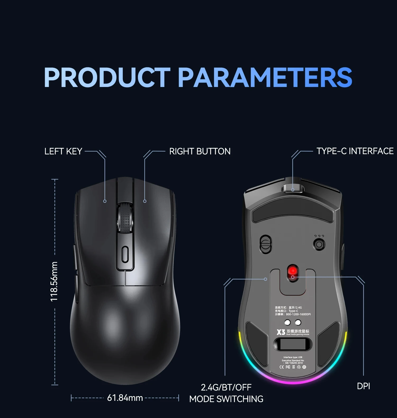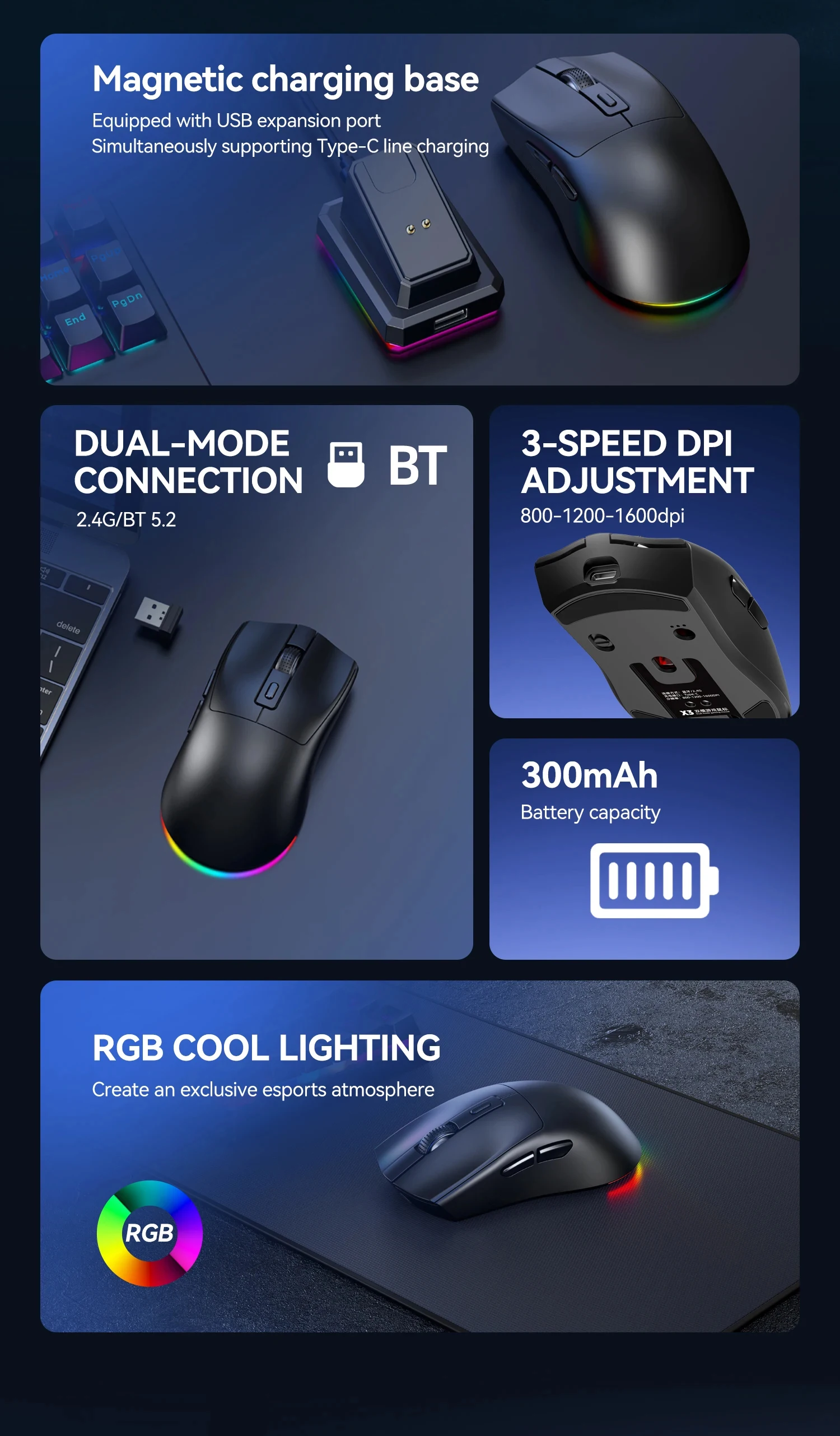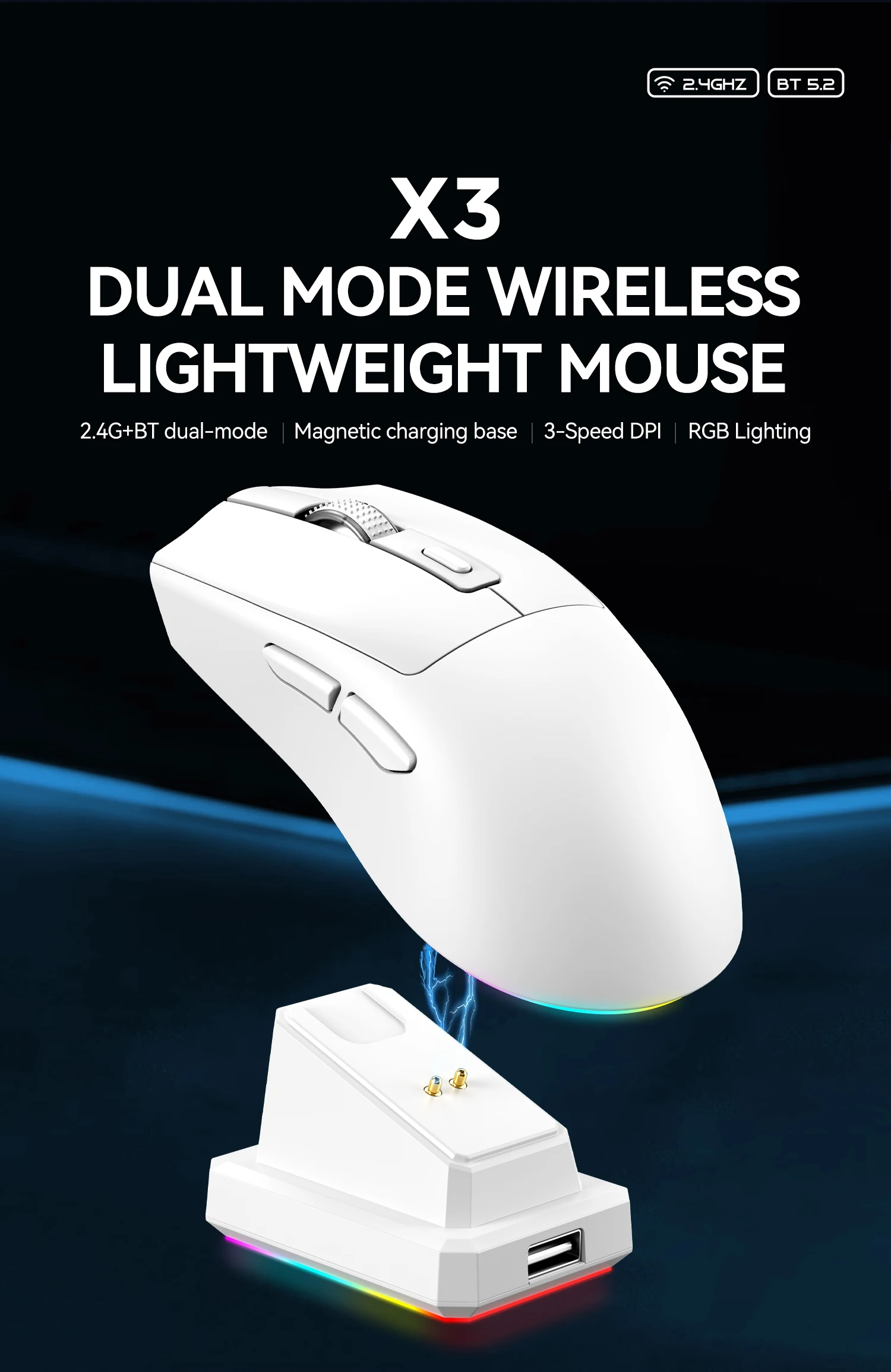 X3 Wireless Mouse Dual-Mode 2.4G BT Connection 1600 DPI Adjustable Lightweight Gaming Mouse RGB Light Magnetic Charging Base