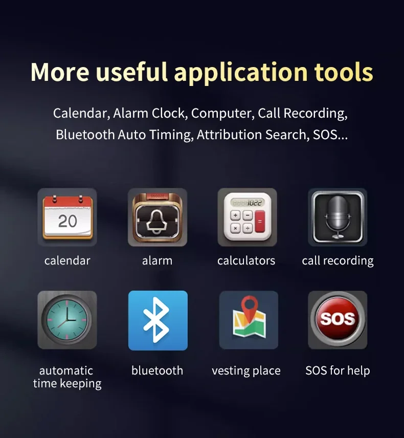 Function: camera, photos, game, audio,video,Calculator, e-book, calendar,the family number,SOS