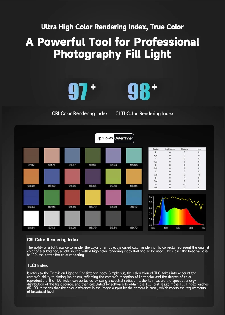 With a CRI of 97+, this LED light ensures true-to-life color reproduction, perfect for professional video production.