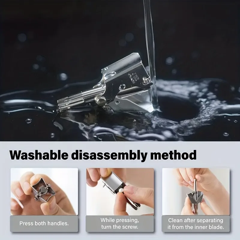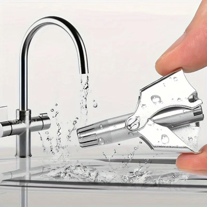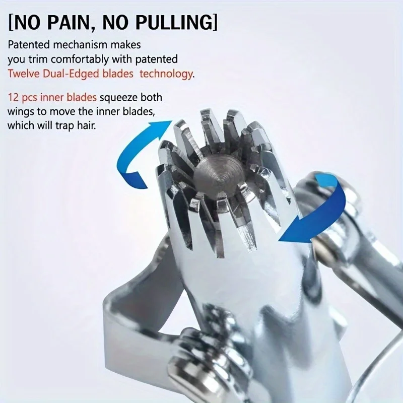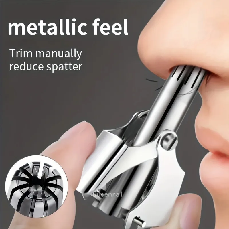 This manual nose hair trimmer is designed for one-handed operation, offering quick and effective grooming with its durable stainless steel construction and waterproof features.