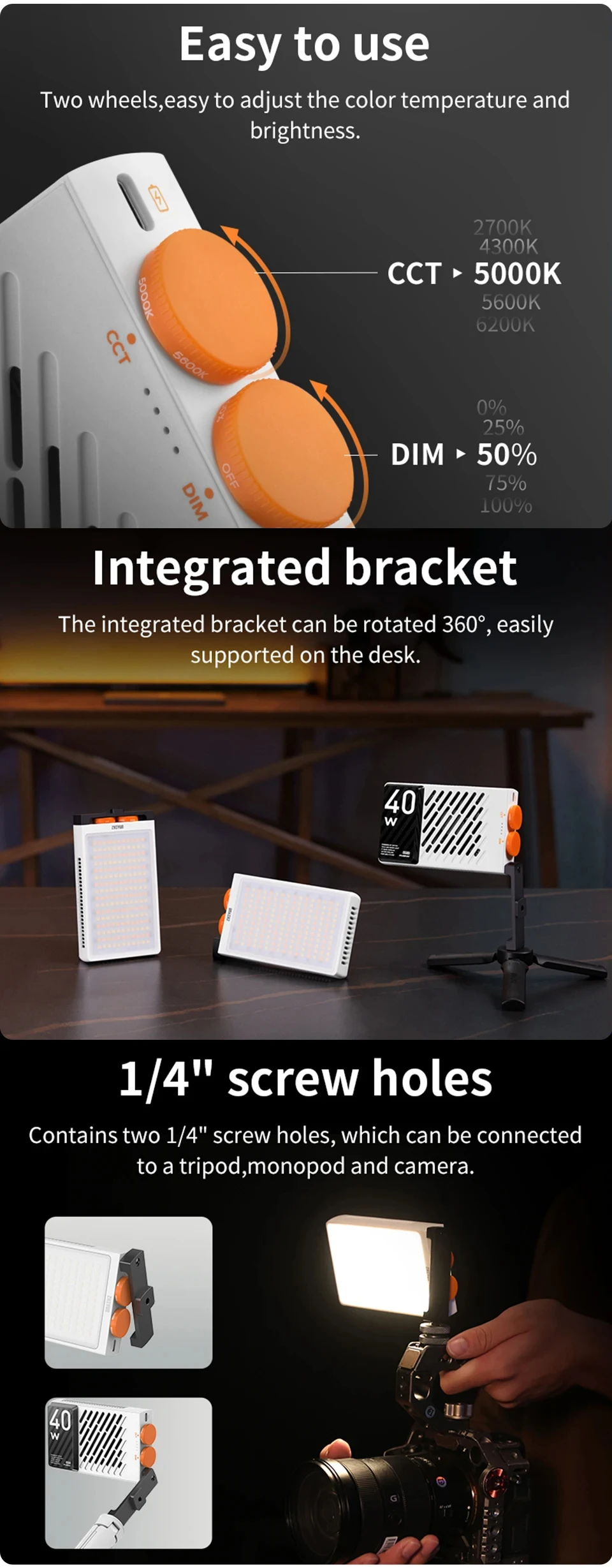 Offer adjustable dual color temperature ranging from 2700K to 6200K with no strobes.